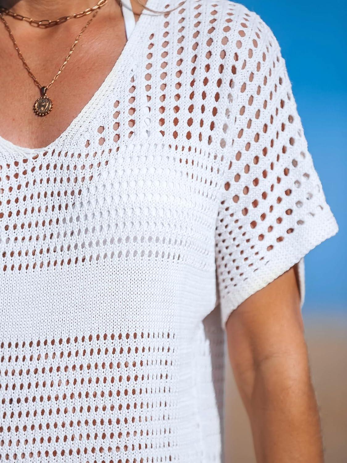 CUPSHE Women Crochet Swimsuit Cover Up Short Sleeve Beach Dress V Neck Bathing Suit Coverups for Beach Swimwear(White)