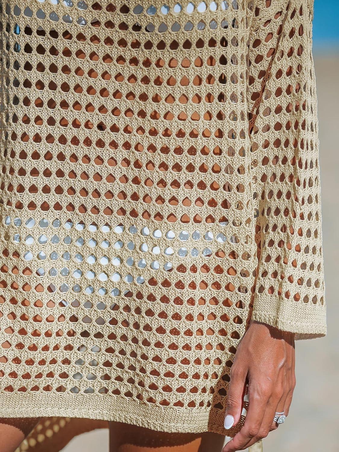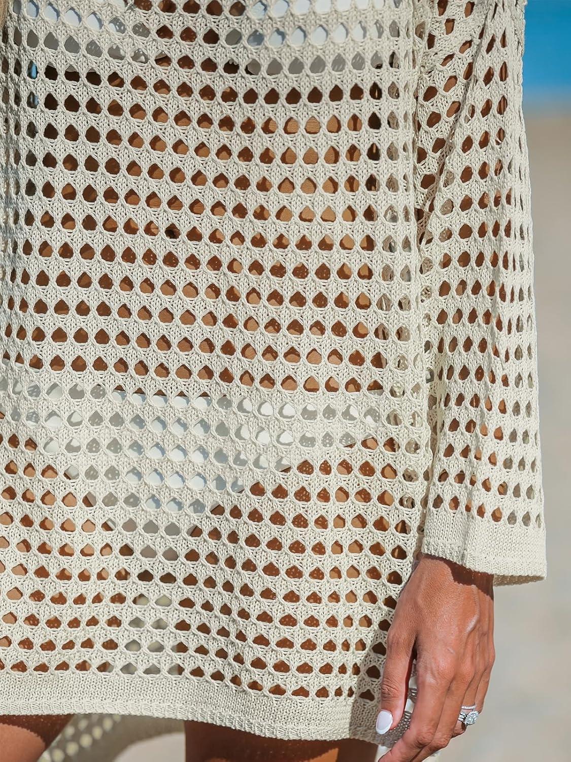 CUPSHE Women Crochet Swimsuit Cover Ups Long Sleeve Summer Beach Coverup Dress for Swimwear(Neutral)