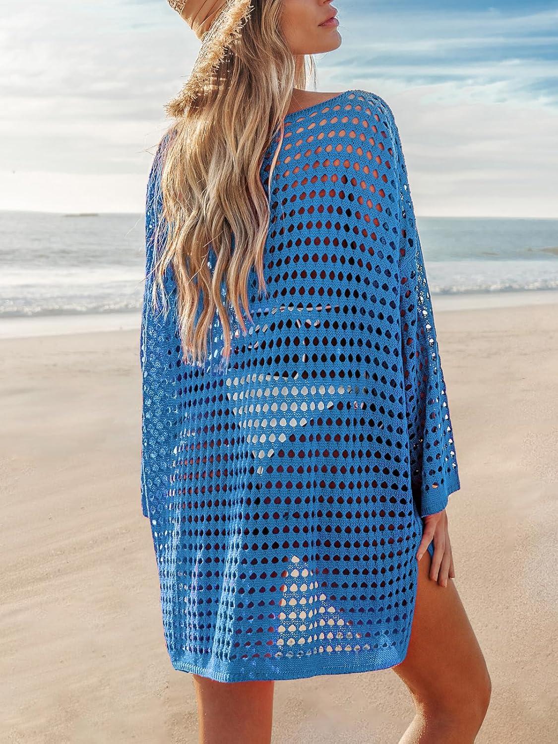 CUPSHE Women Crochet Swimsuit Cover Ups Long Sleeve Summer Beach Coverup Dress for Swimwear(Blue)