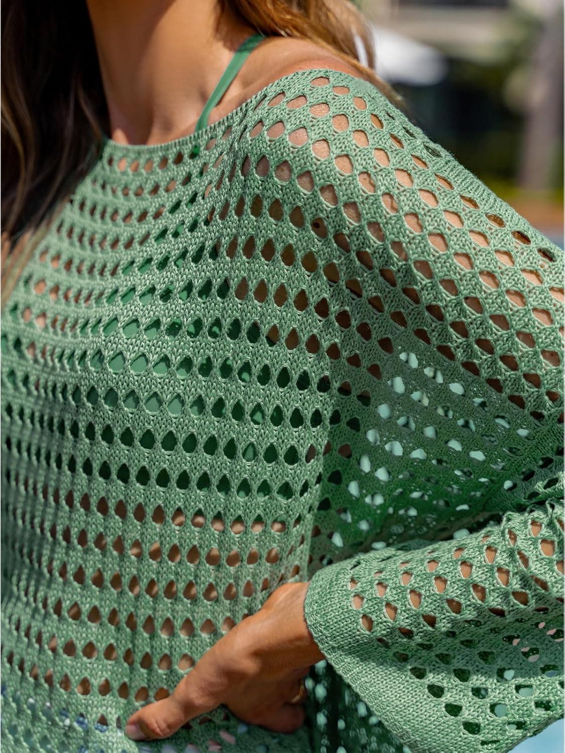 CUPSHE Women Crochet Swimsuit Cover Ups One Shoulder Long Sleeve Beach Coverup Tops(Light Green)