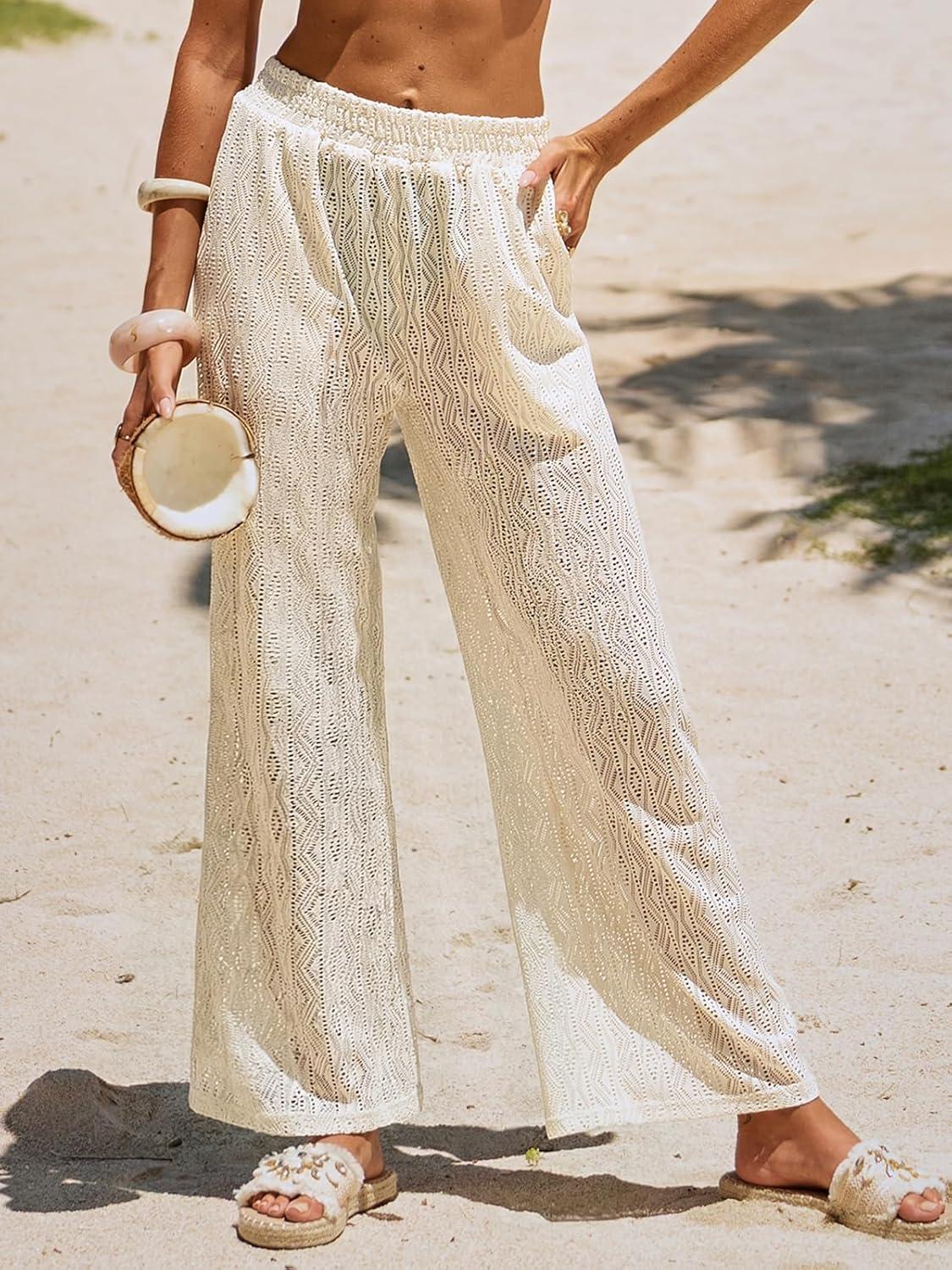 CUPSHE Women Swimsuit Coverup Pants Wide Leg Sheer Mesh Beach Pants with Side Pockets(Beige)