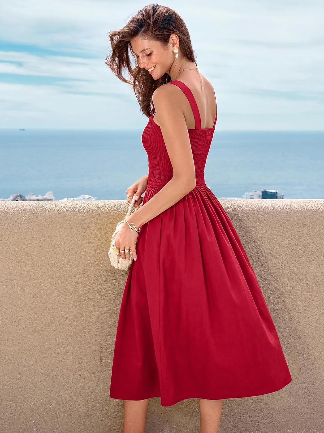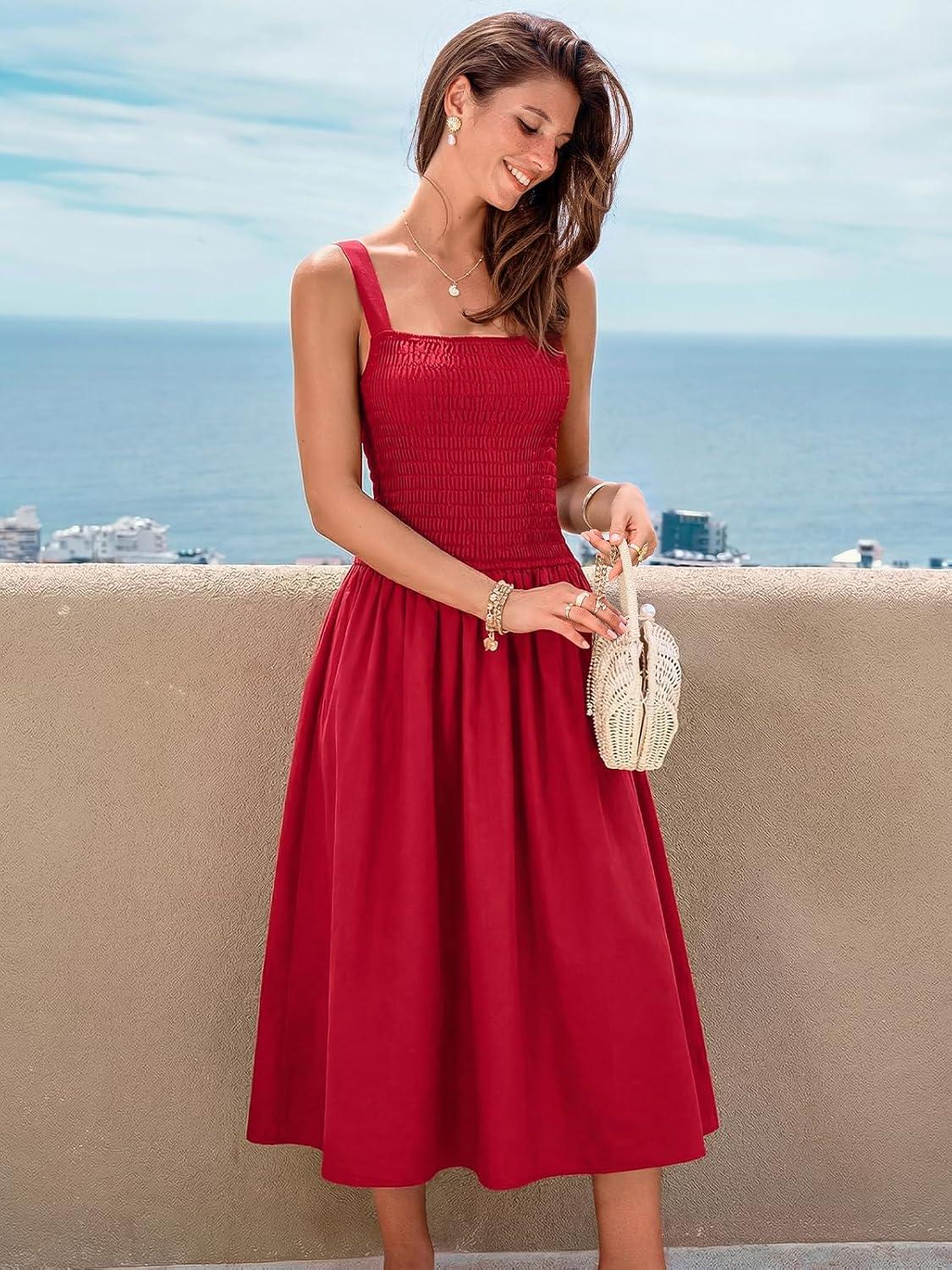 CUPSHE Women’s Smocked Flowy Maxi Dress Sleeveless Square Neck Wide Strap A Line Sundress for Summer Casual Vacation(Red)