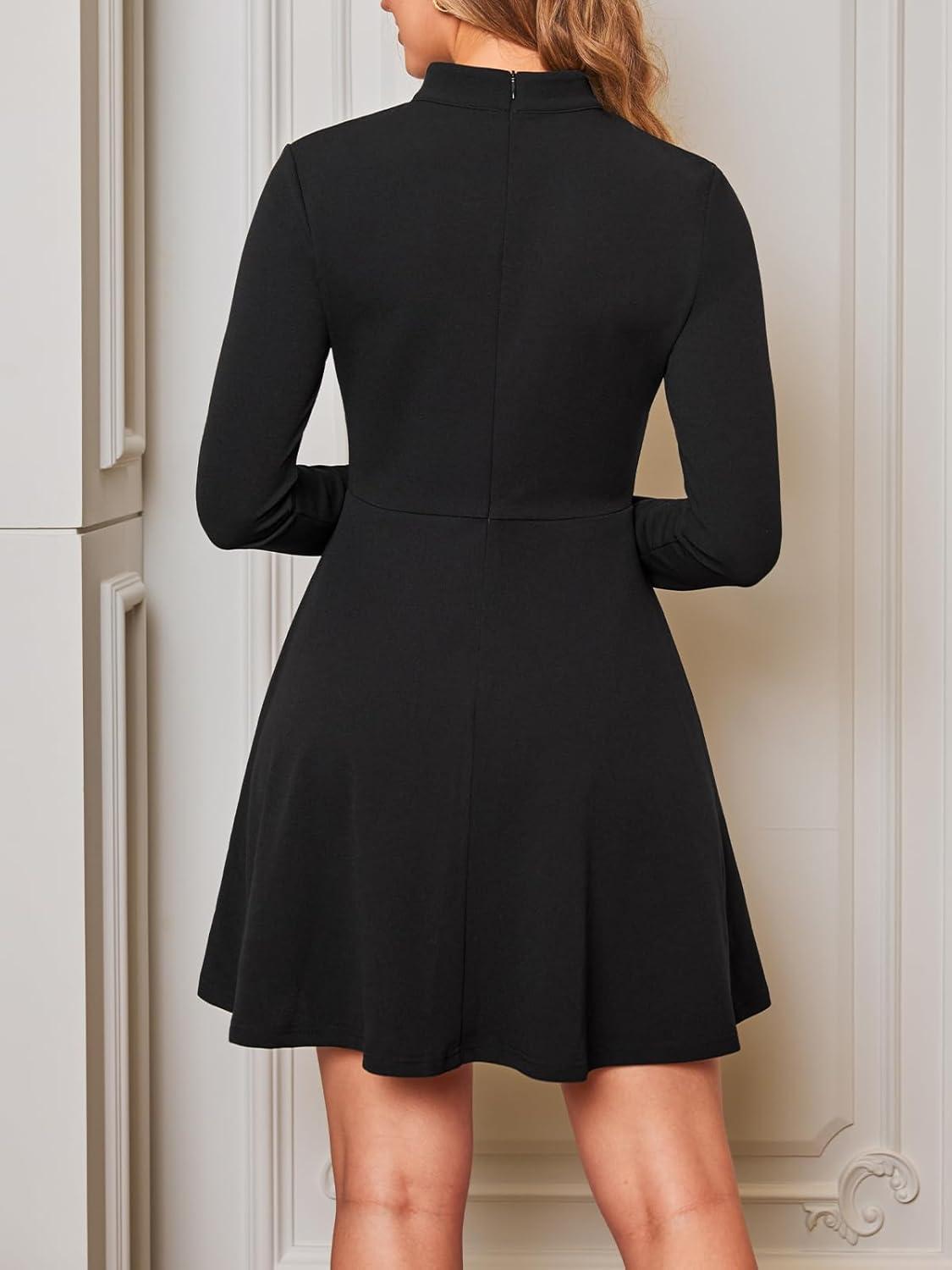 CUPSHE Women’s Winter Dresses Mock Neck Mesh A-Line Pleated Long Sleeve Cocktail Party Mini Dress(Black)