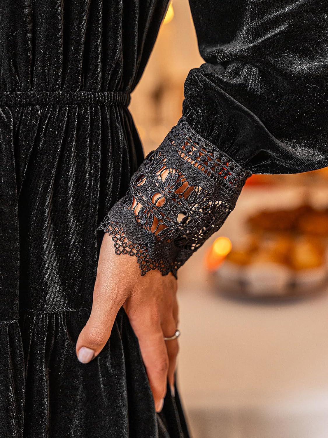 CUPSHE Womens Mini Fall Dresses Velvet V Neck Casual Long Sleeve Lace Short Ruffled Party Outfit Flowy Cocktail Dress(Black)