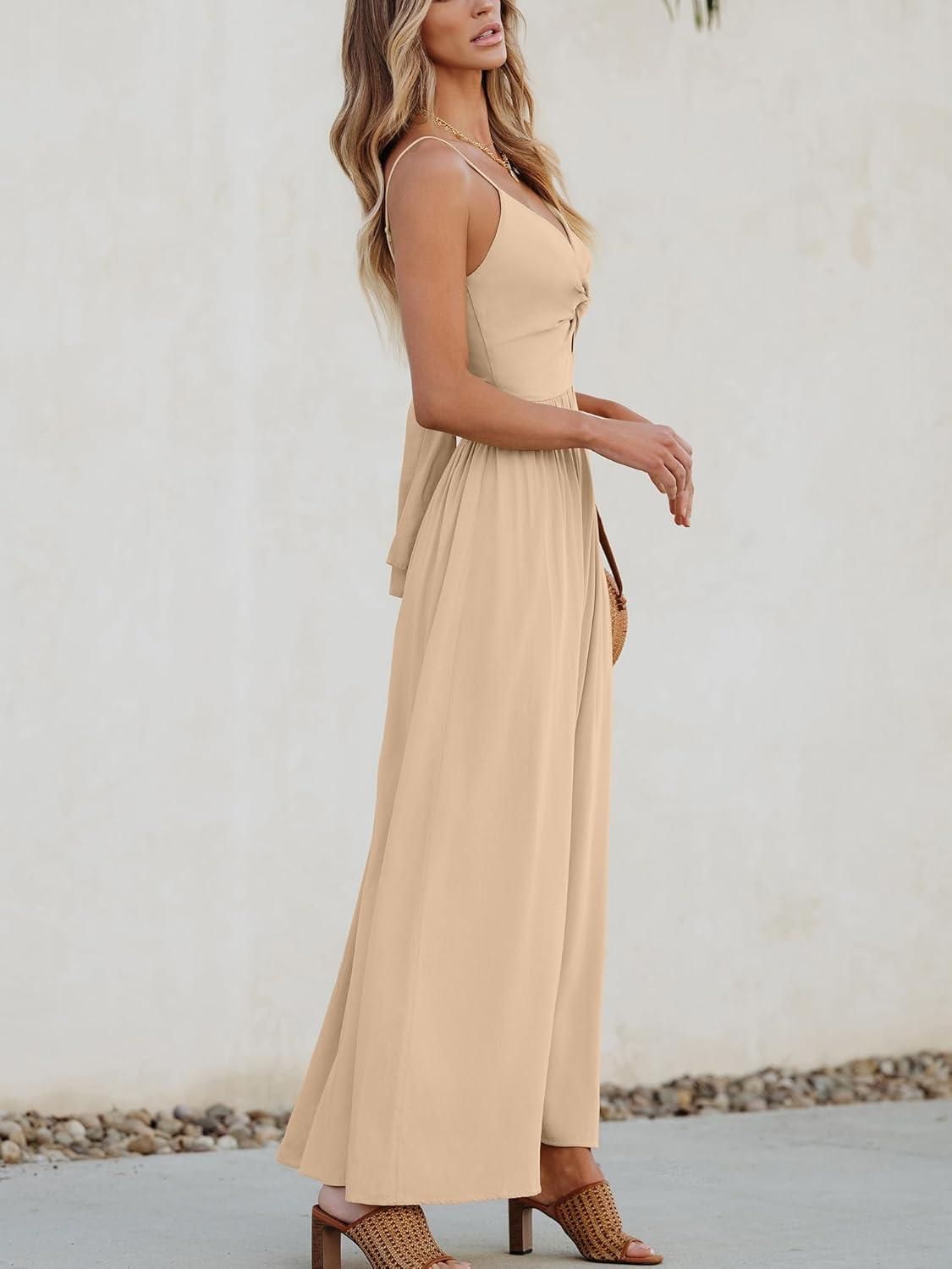CUPSHE Women Casual Dress Beach Sleeveless V Neck Summer Cutout Spaghetti Straps Formal Maxi Sun Dresses(Beige)