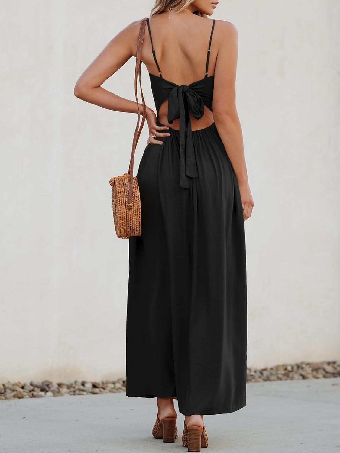 CUPSHE Women Casual Dress Beach Sleeveless V Neck Summer Cutout Spaghetti Straps Formal Maxi Sun Dresses(B-black)