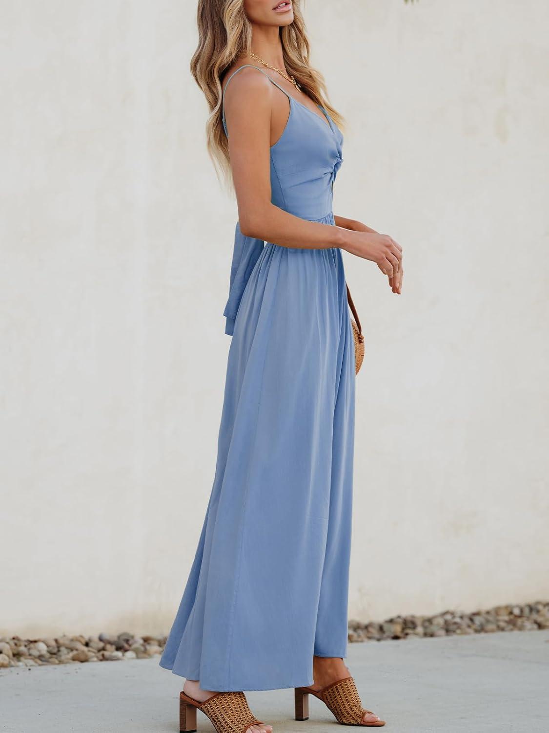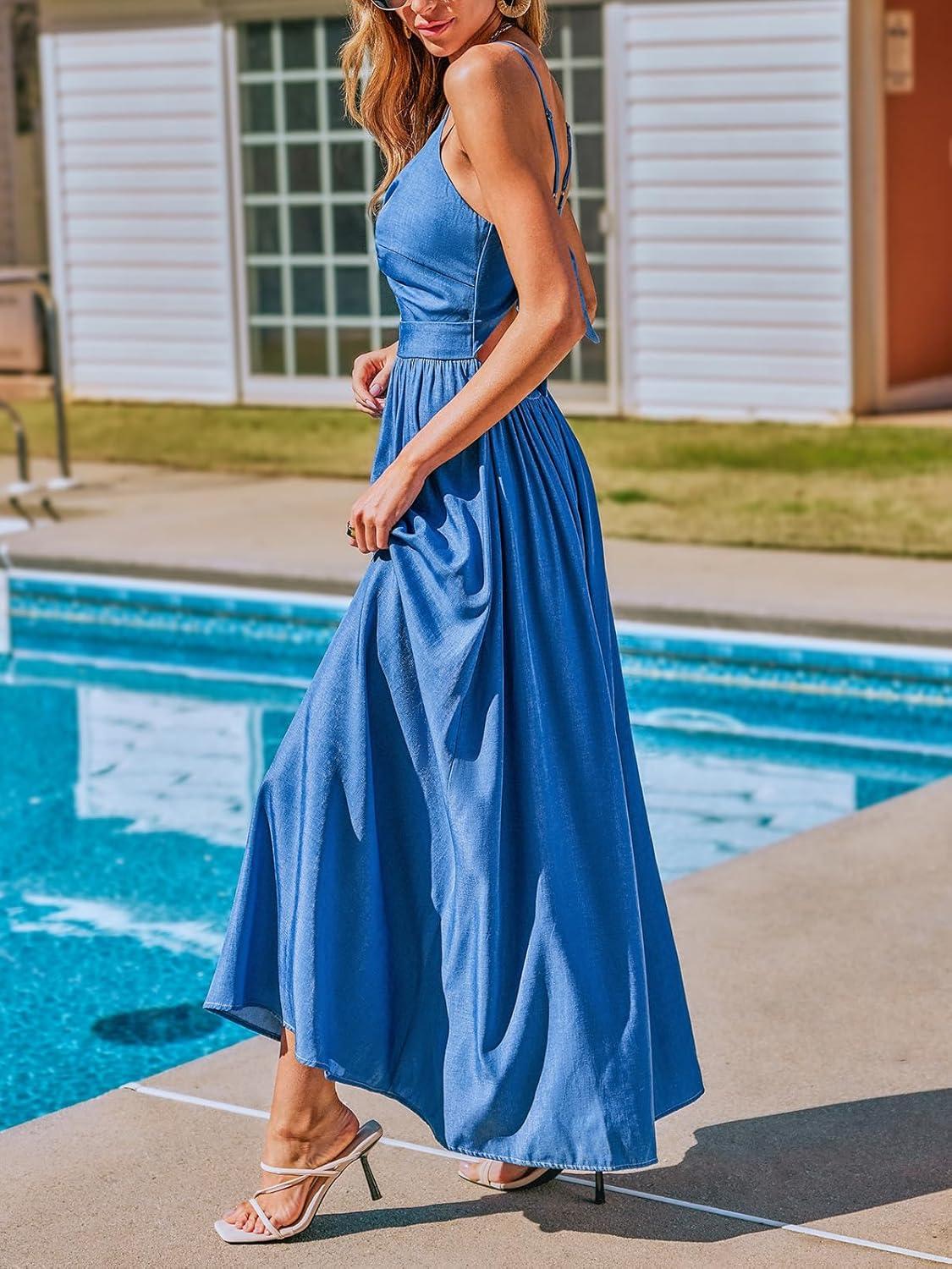 CUPSHE Women Casual Dress Beach Sleeveless V Neck Summer Cutout Spaghetti Straps Formal Maxi Sun Dresses(Denim Blue)