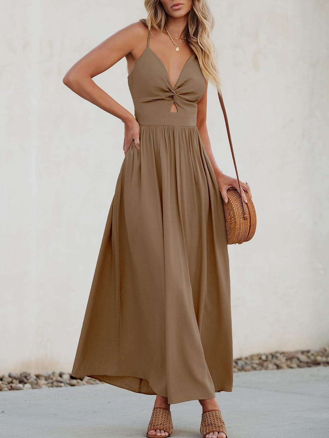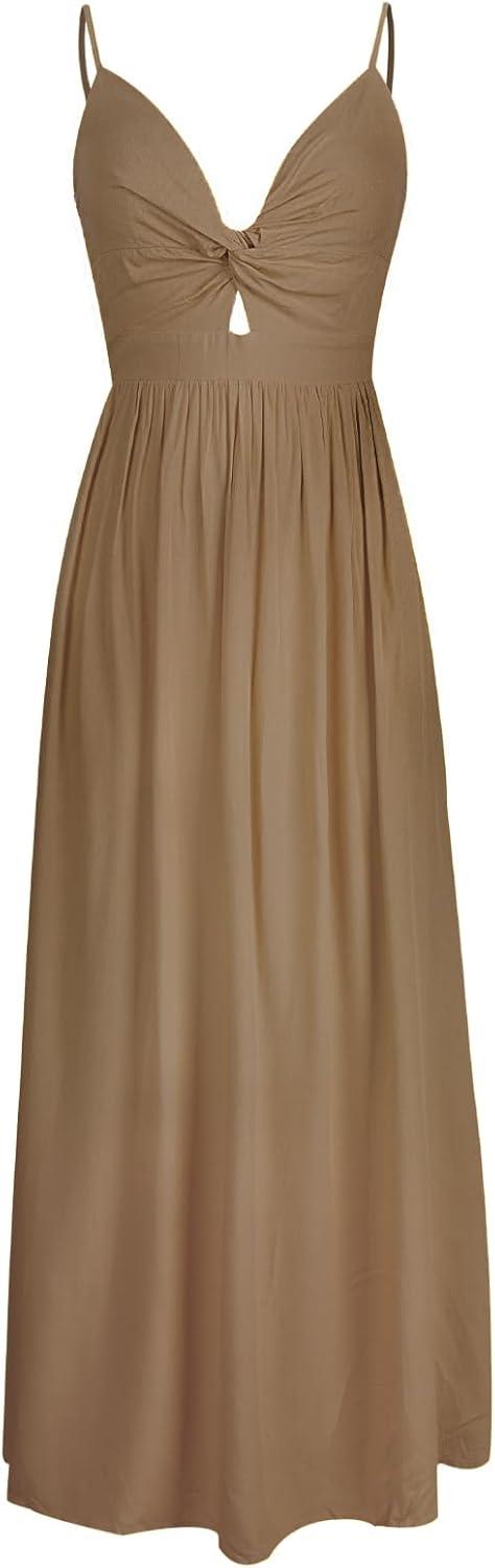 CUPSHE Women Casual Dress Beach Sleeveless V Neck Summer Cutout Spaghetti Straps Formal Maxi Sun Dresses(Coffee)