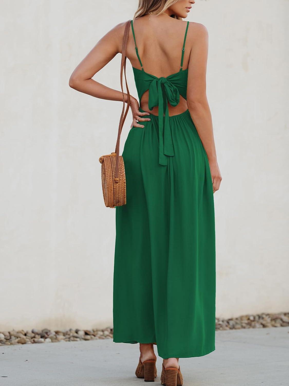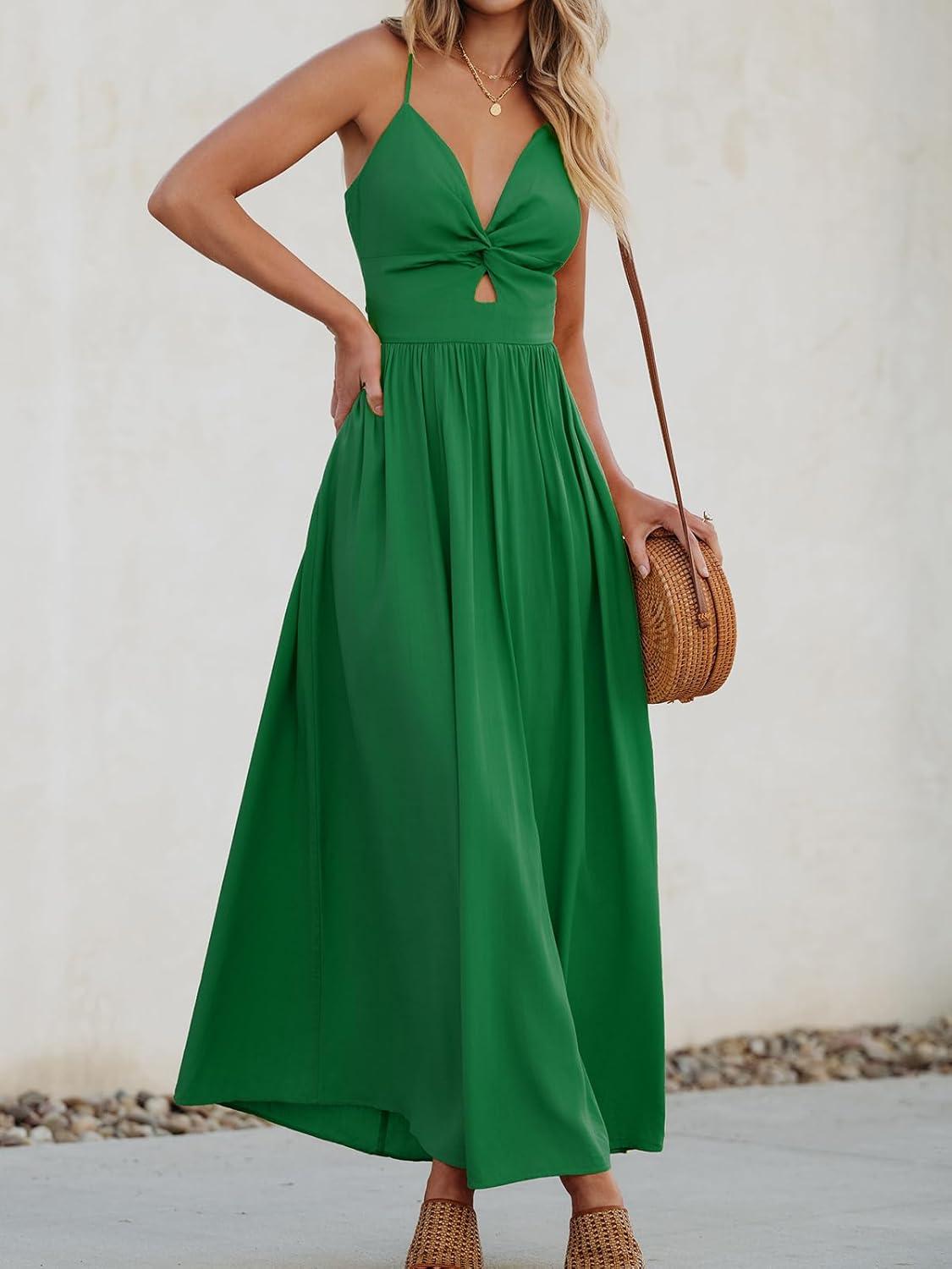 CUPSHE Women Casual Dress Beach Sleeveless V Neck Summer Cutout Spaghetti Straps Formal Maxi Sun Dresses(Dark Green)