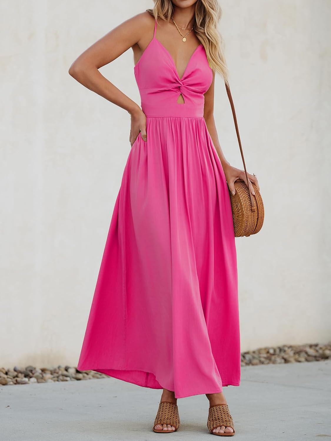 CUPSHE Women Casual Dress Beach Sleeveless V Neck Summer Cutout Spaghetti Straps Formal Maxi Sun Dresses(Hot Pink)