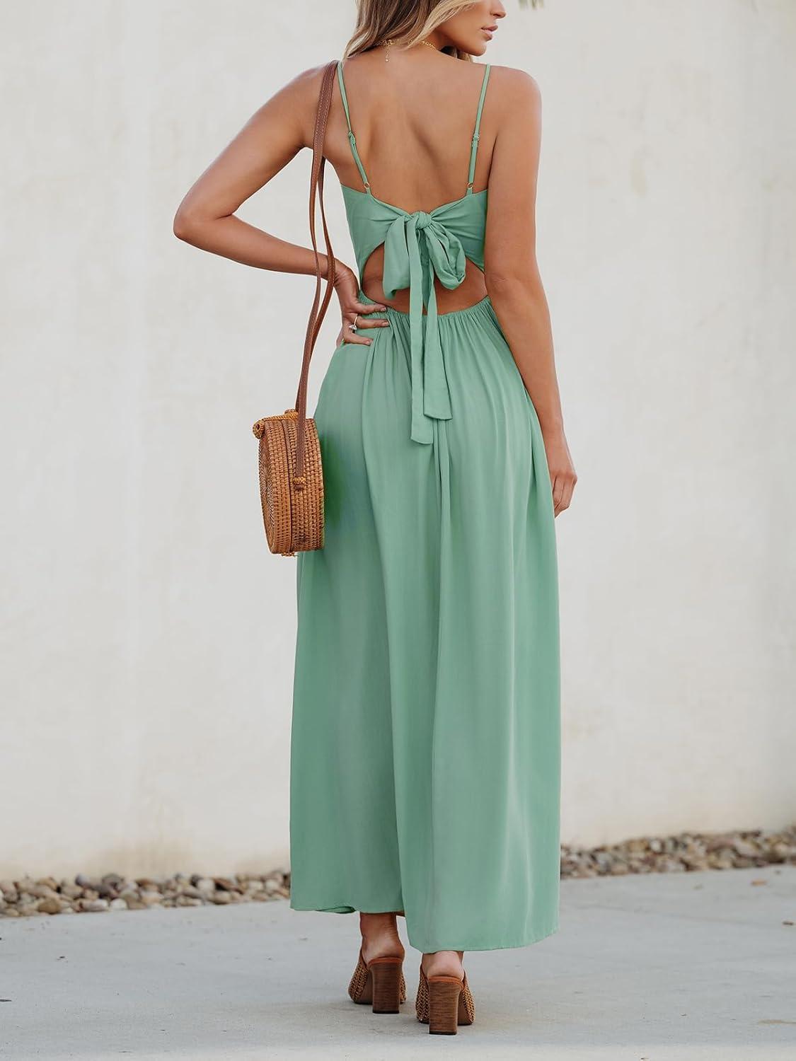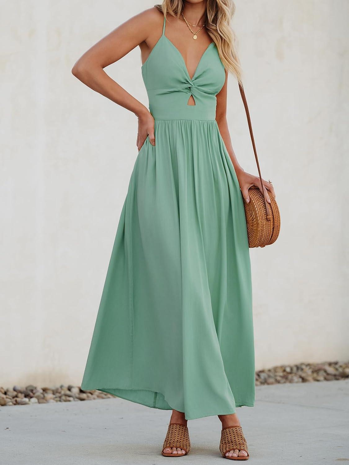CUPSHE Women Casual Dress Beach Sleeveless V Neck Summer Cutout Spaghetti Straps Formal Maxi Sun Dresses(Green)