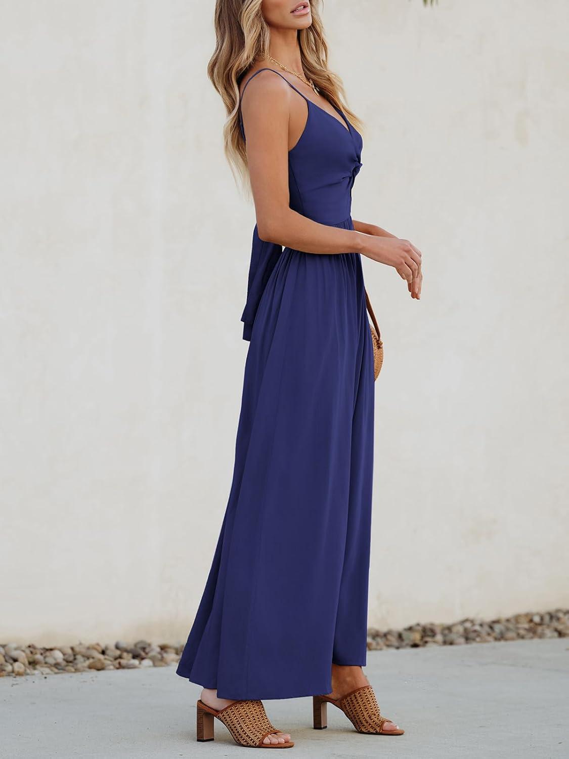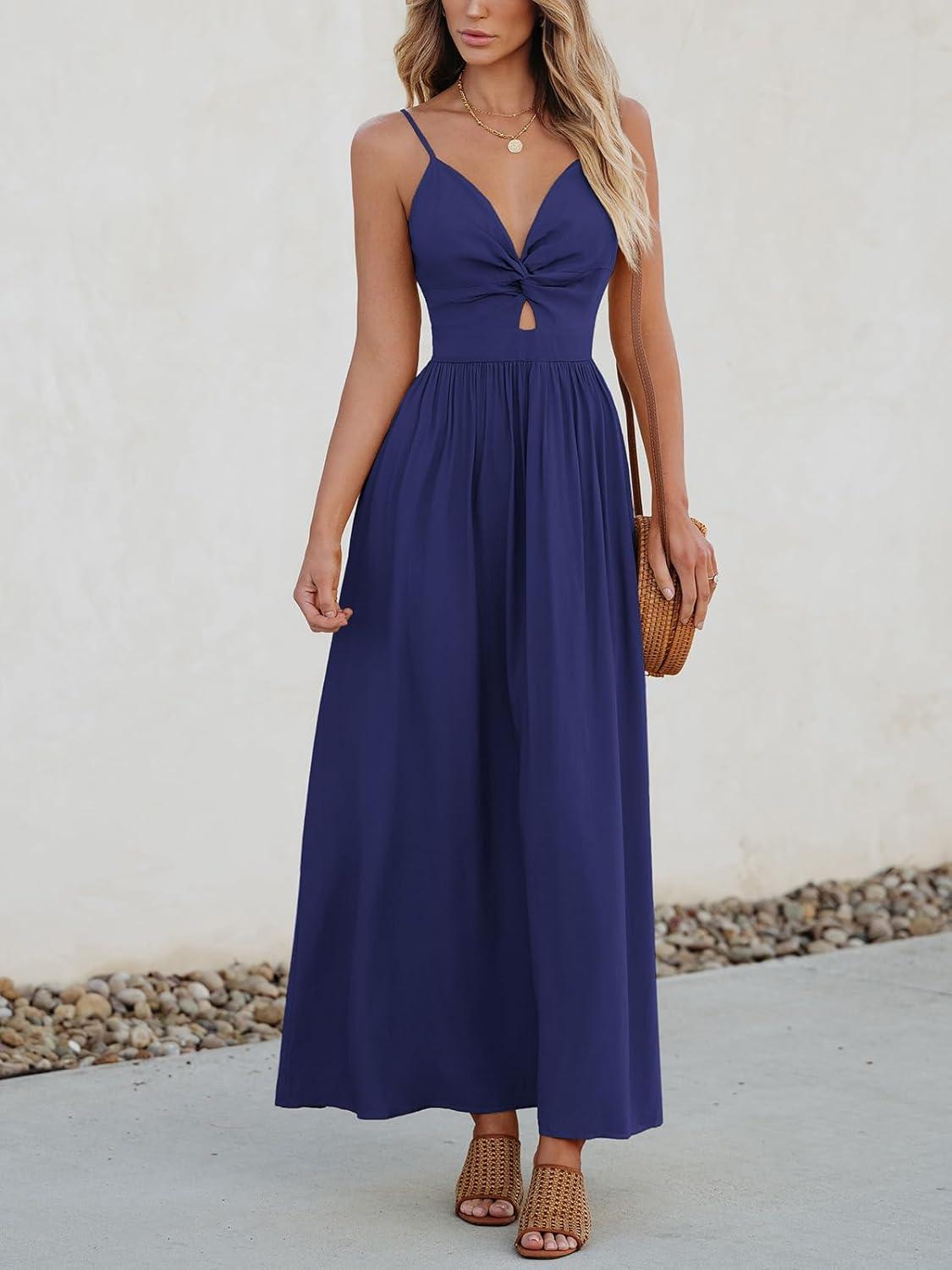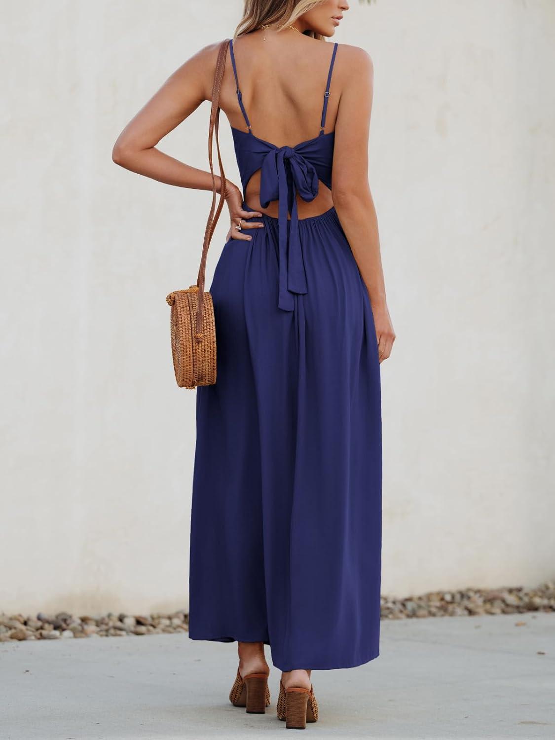 CUPSHE Women Casual Dress Beach Sleeveless V Neck Summer Cutout Spaghetti Straps Formal Maxi Sun Dresses(Navy Blue)