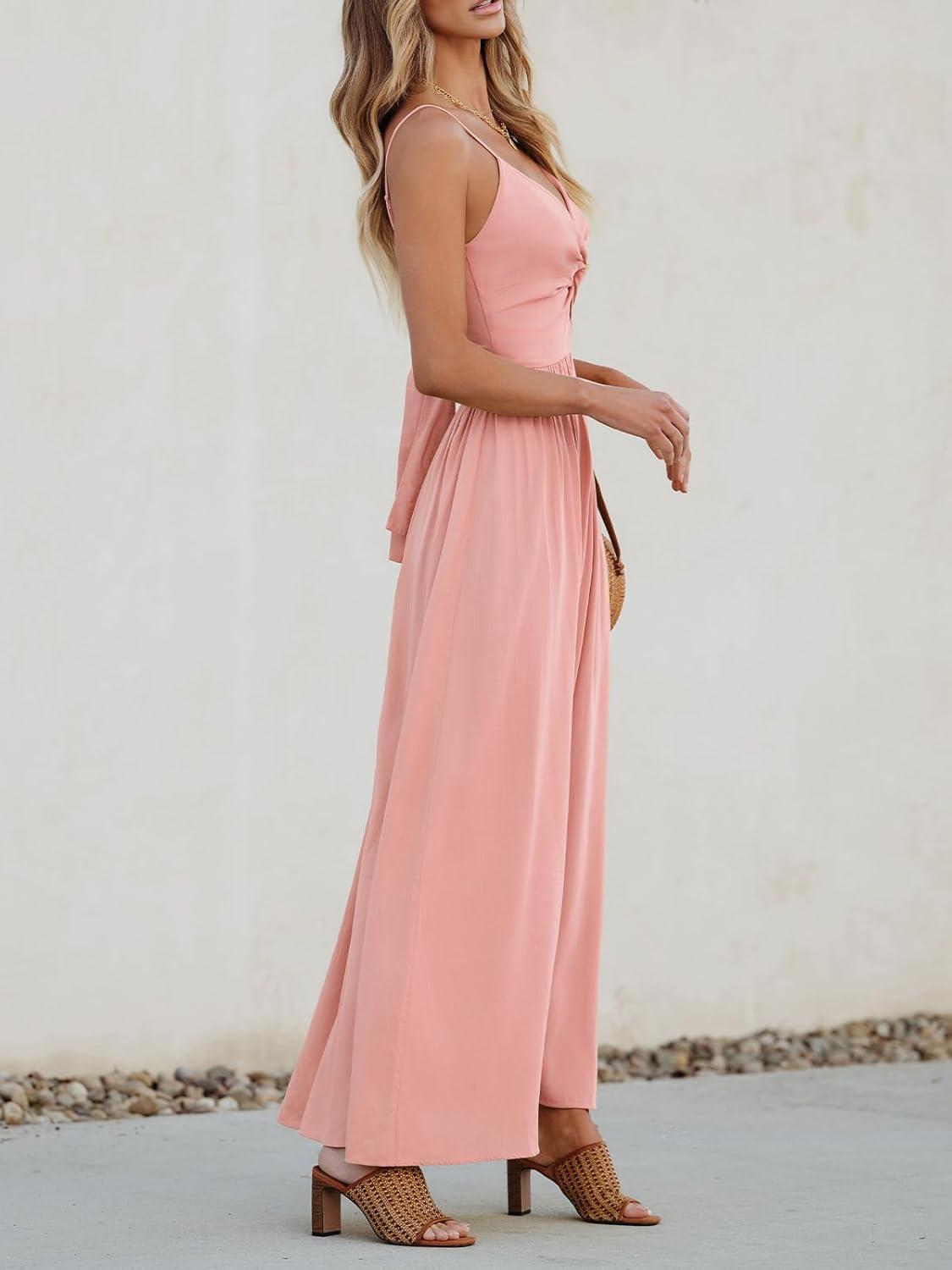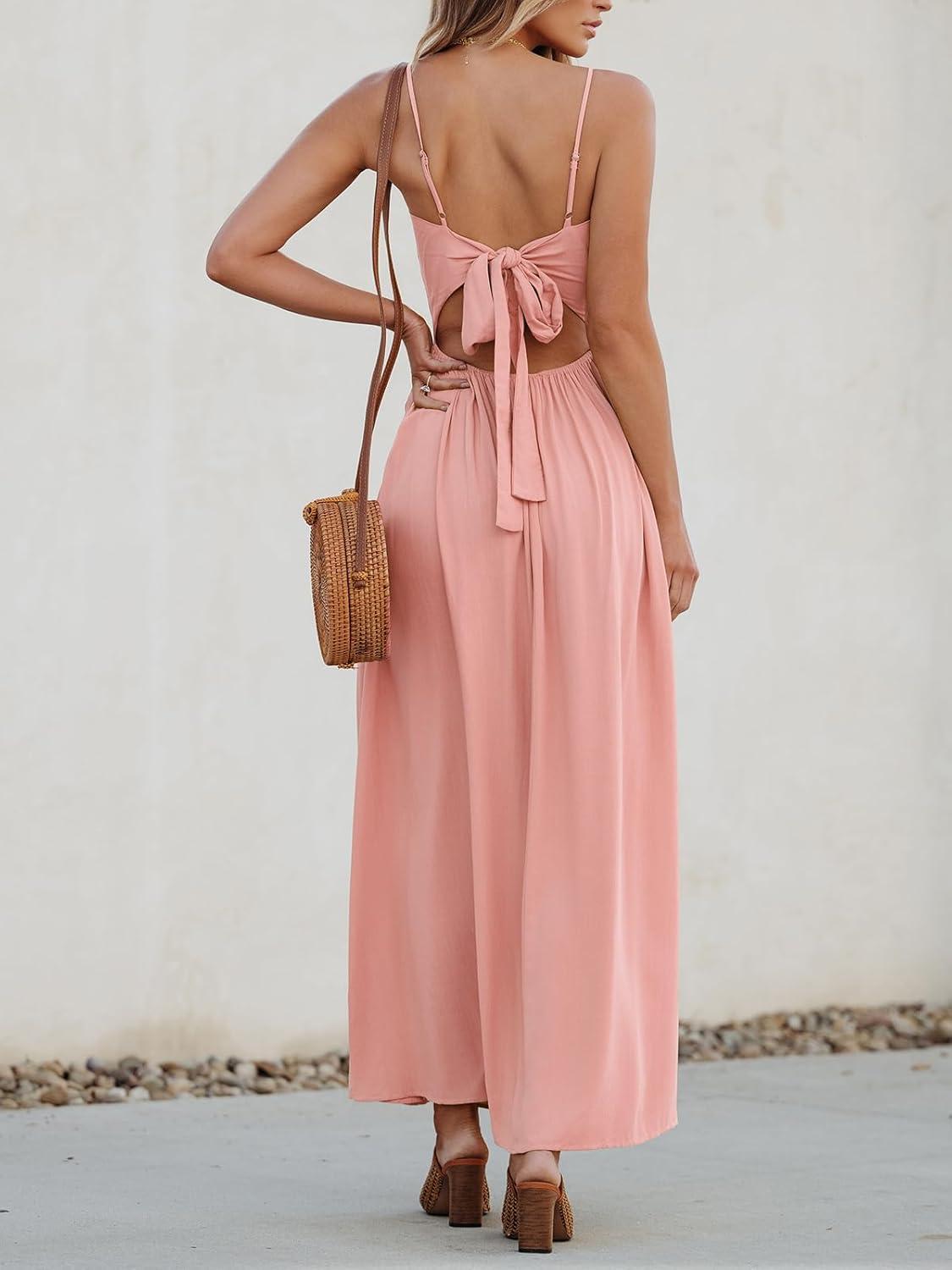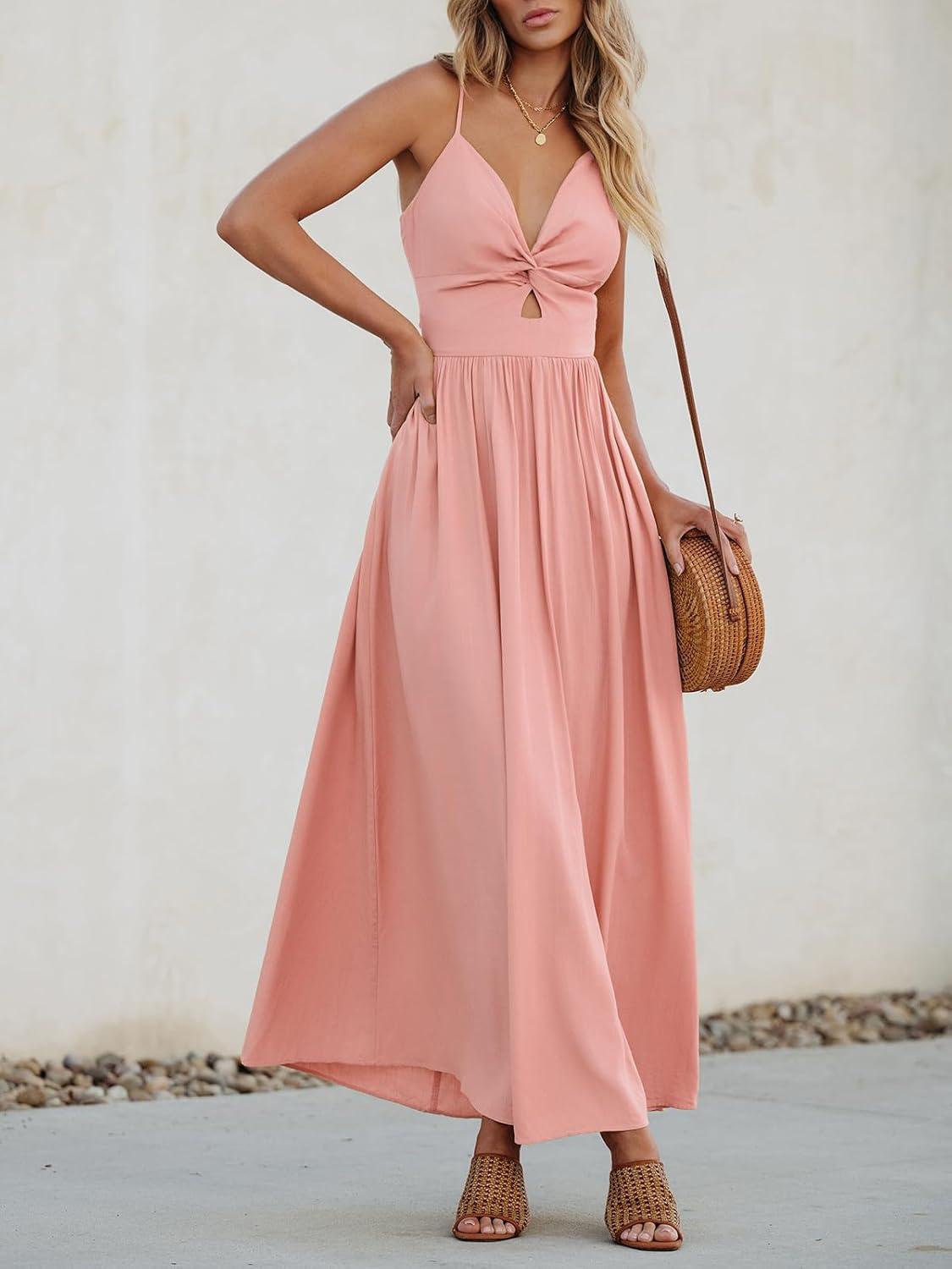CUPSHE Women Casual Dress Beach Sleeveless V Neck Summer Cutout Spaghetti Straps Formal Maxi Sun Dresses(Pink)