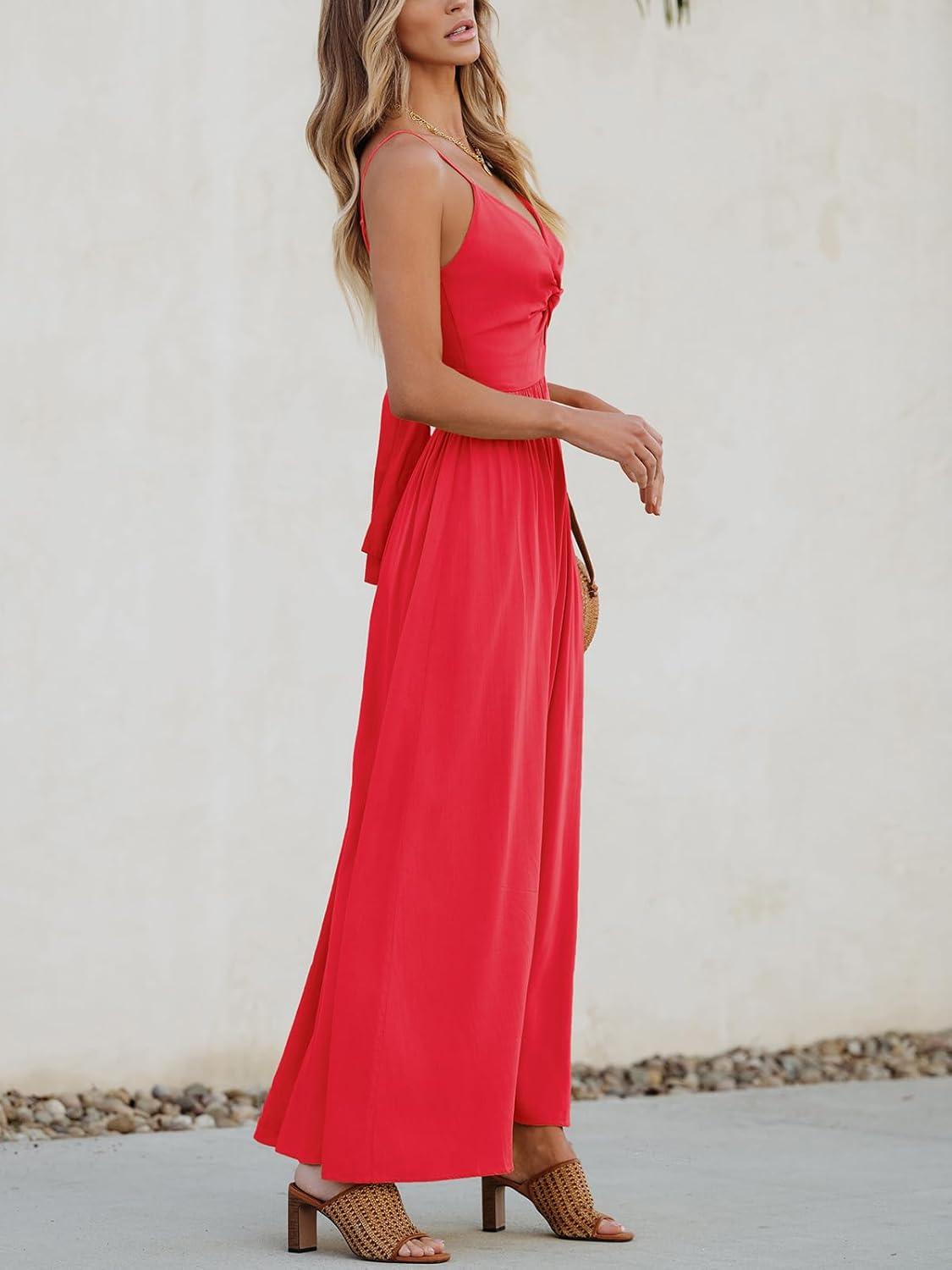 CUPSHE Women Casual Dress Beach Sleeveless V Neck Summer Cutout Spaghetti Straps Formal Maxi Sun Dresses(Red)