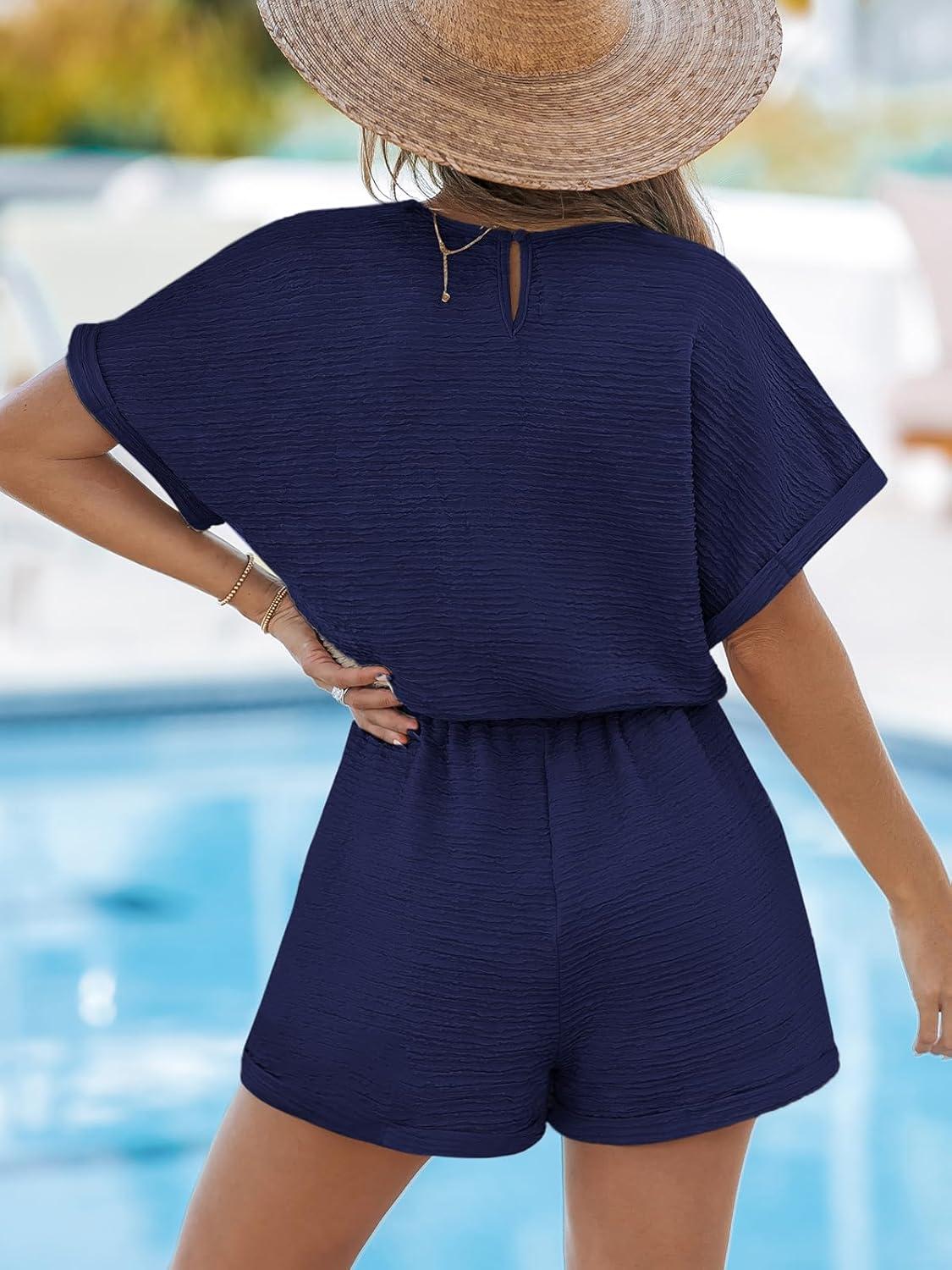 CUPSHE Women’s Romper Knit V Neck Short Sleeves Drawstring Waist Straight leg Outfit Casual Dressy(Navy Blue)