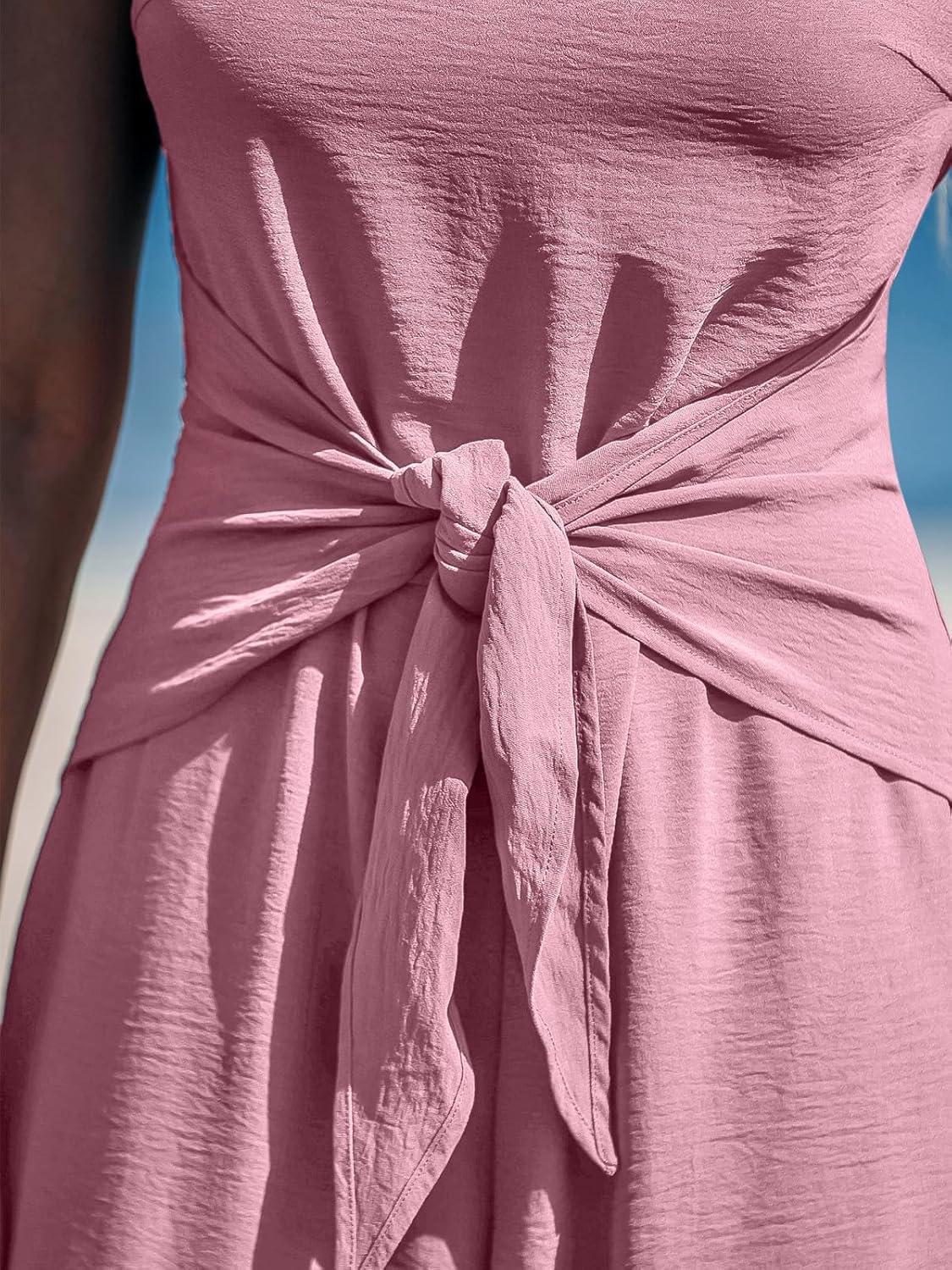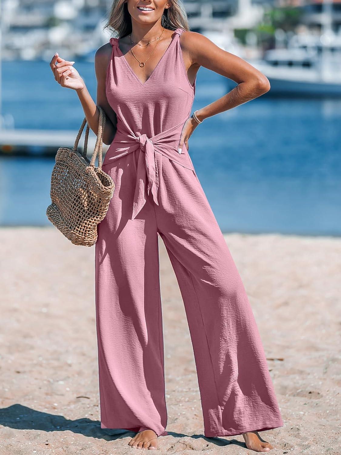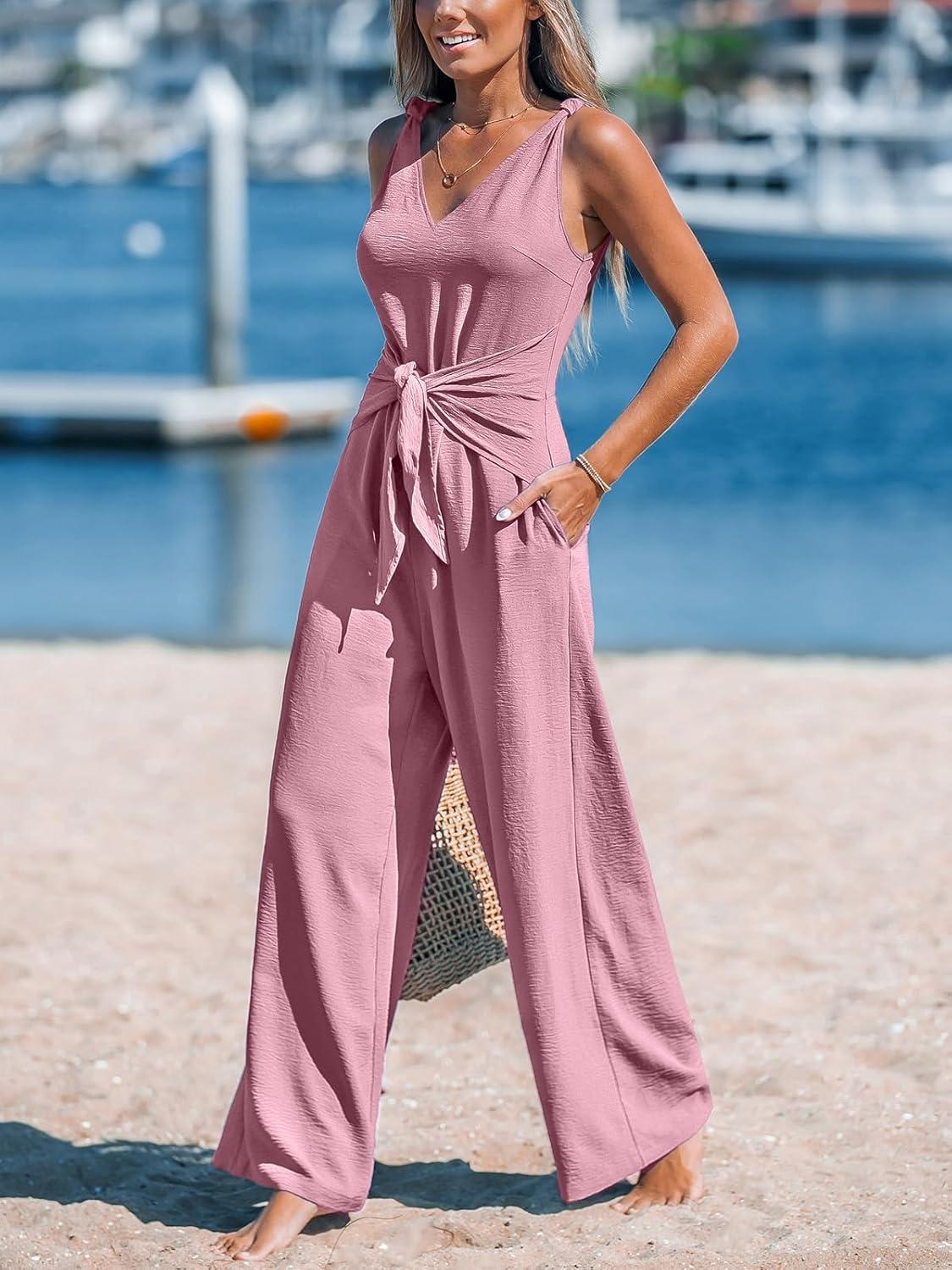 CUPSHE Women’s Summer Jumpsuits Sleeveless Tie Knot Wide Leg Long Pants Romper with Pockets(Pink)