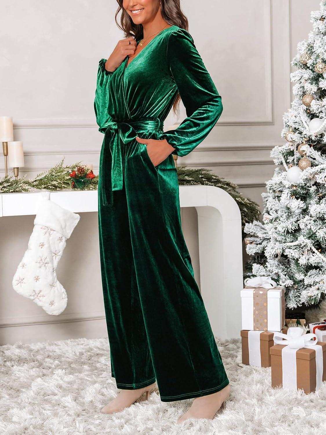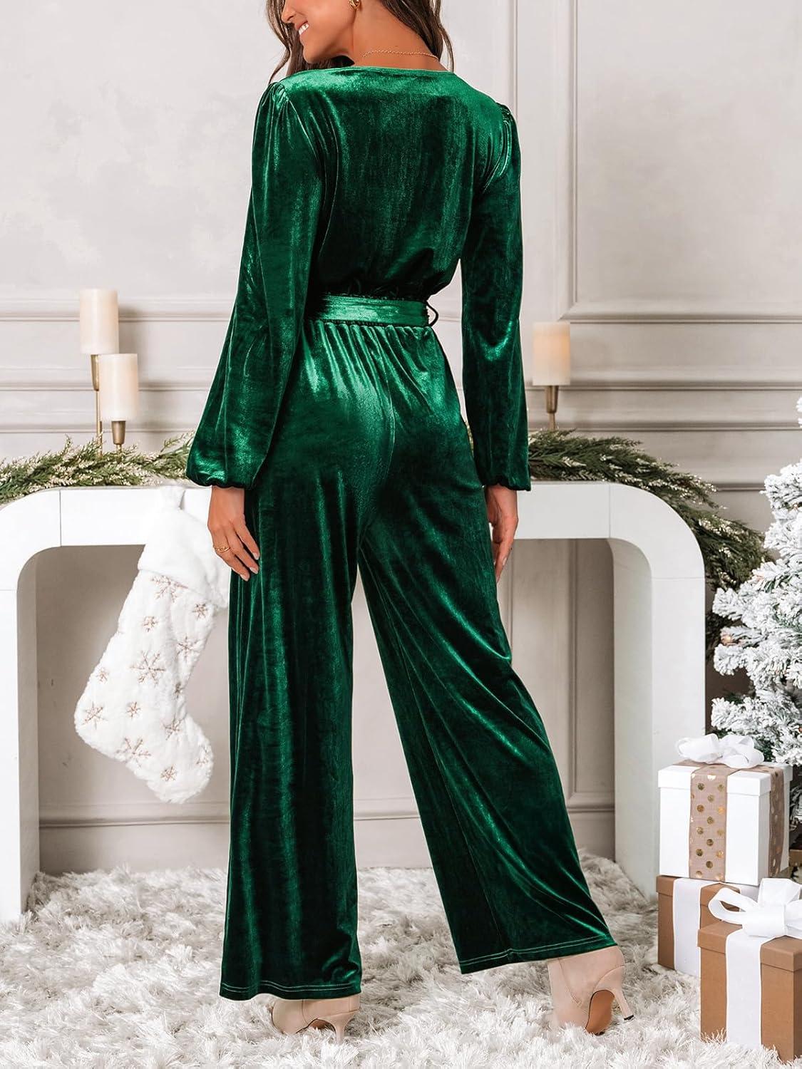 CUPSHE Women’s Romper V Neck Knit Surplice Long Sleeves Waist tie Pockets Straight leg Jumpsuit Outfit Casual Dressy(Green)