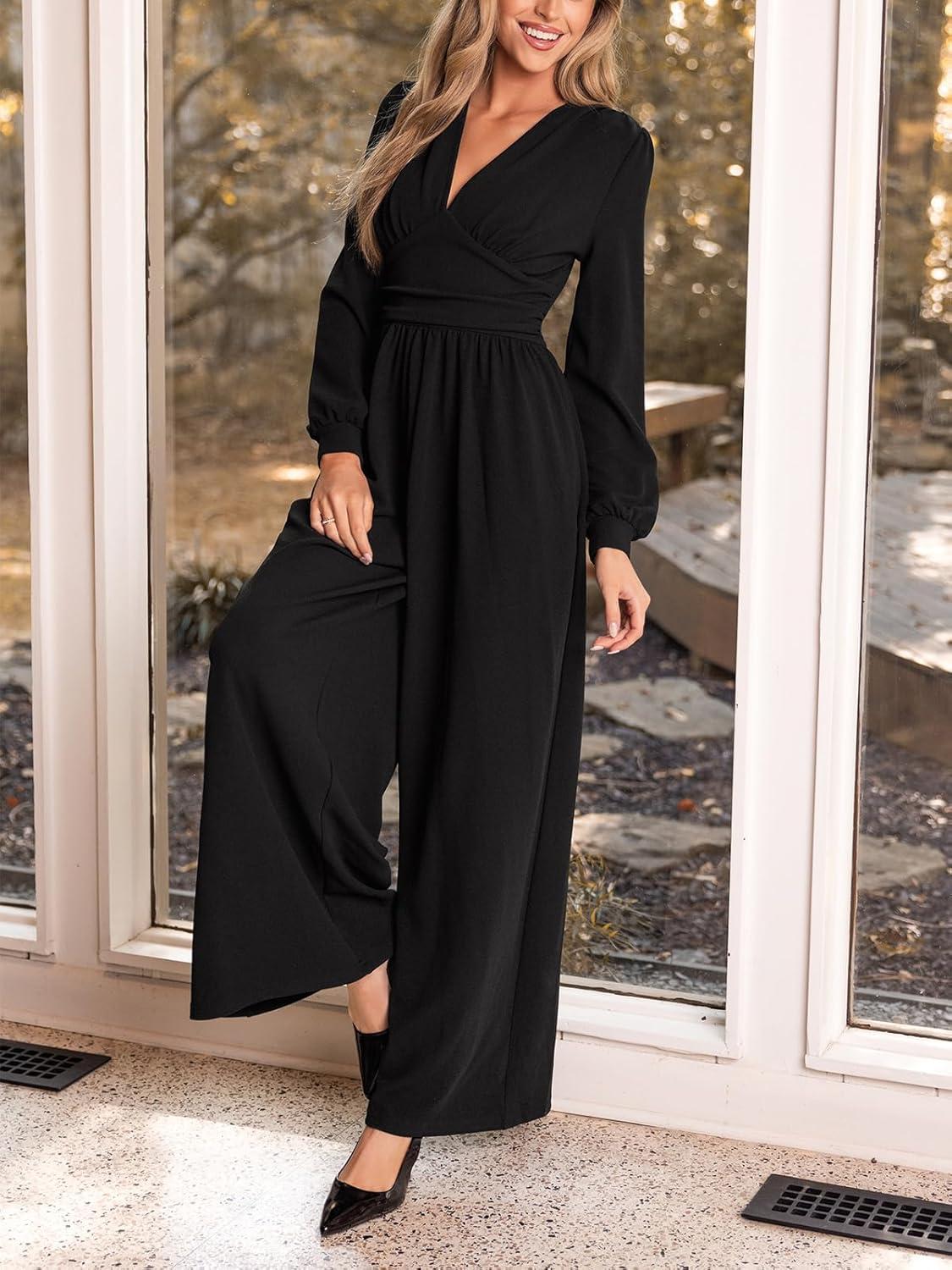 CUPSHE Women’s Romper V Neck Plunging Long Sleeve Ruching Overalls Wide Leg Jumpsuit Outfit Casual Dressy(Black)