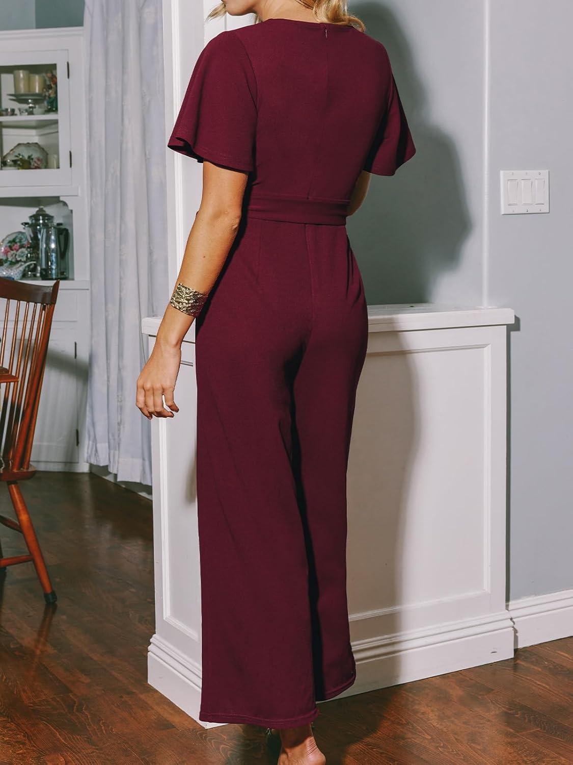 CUPSHE Womens Maxi Jumpsuit Dressy V Neck Short Sleeves Wide Leg Belted One Piece Outfit Overall Casual Fall Romper(Burgundy)