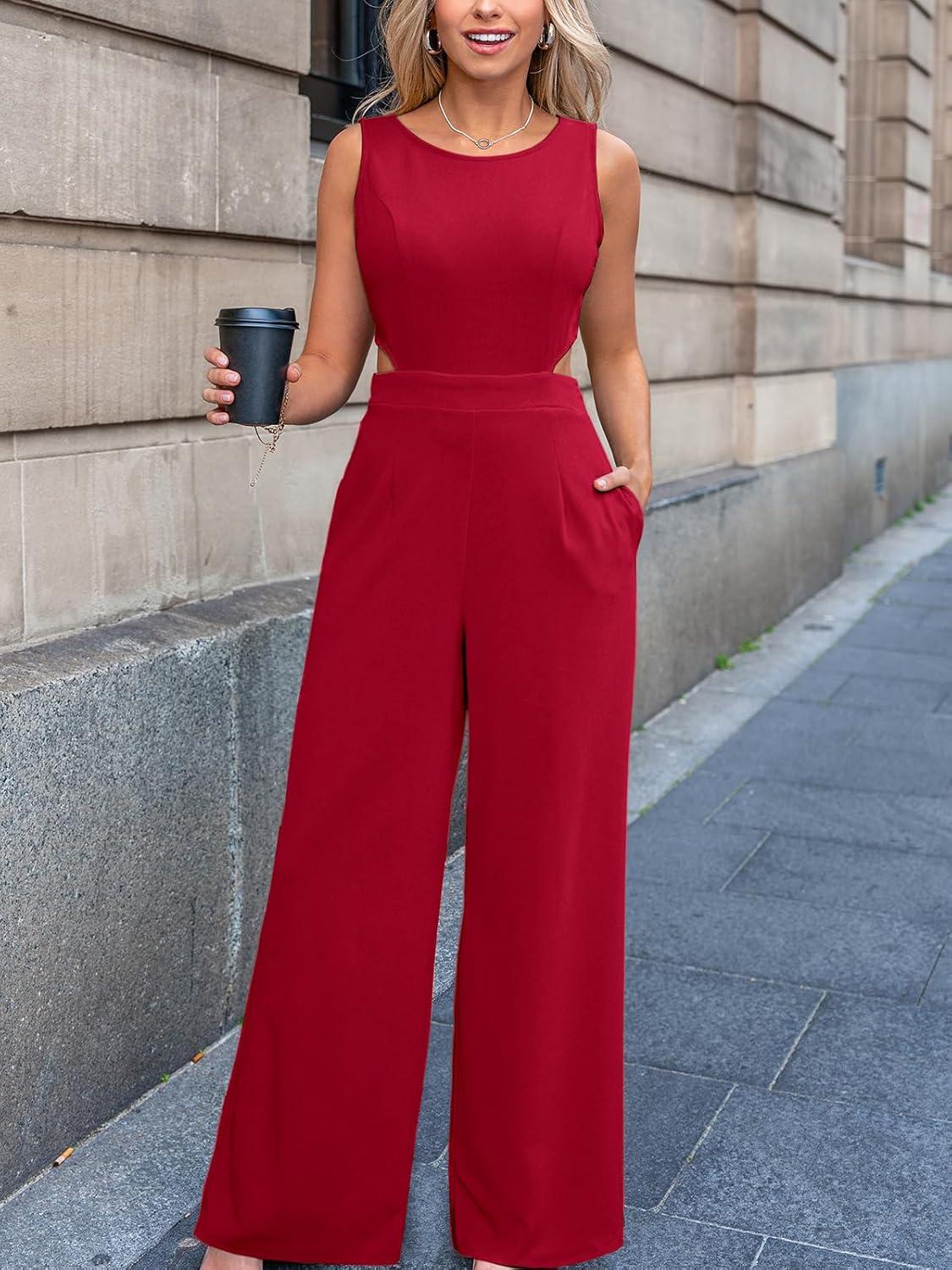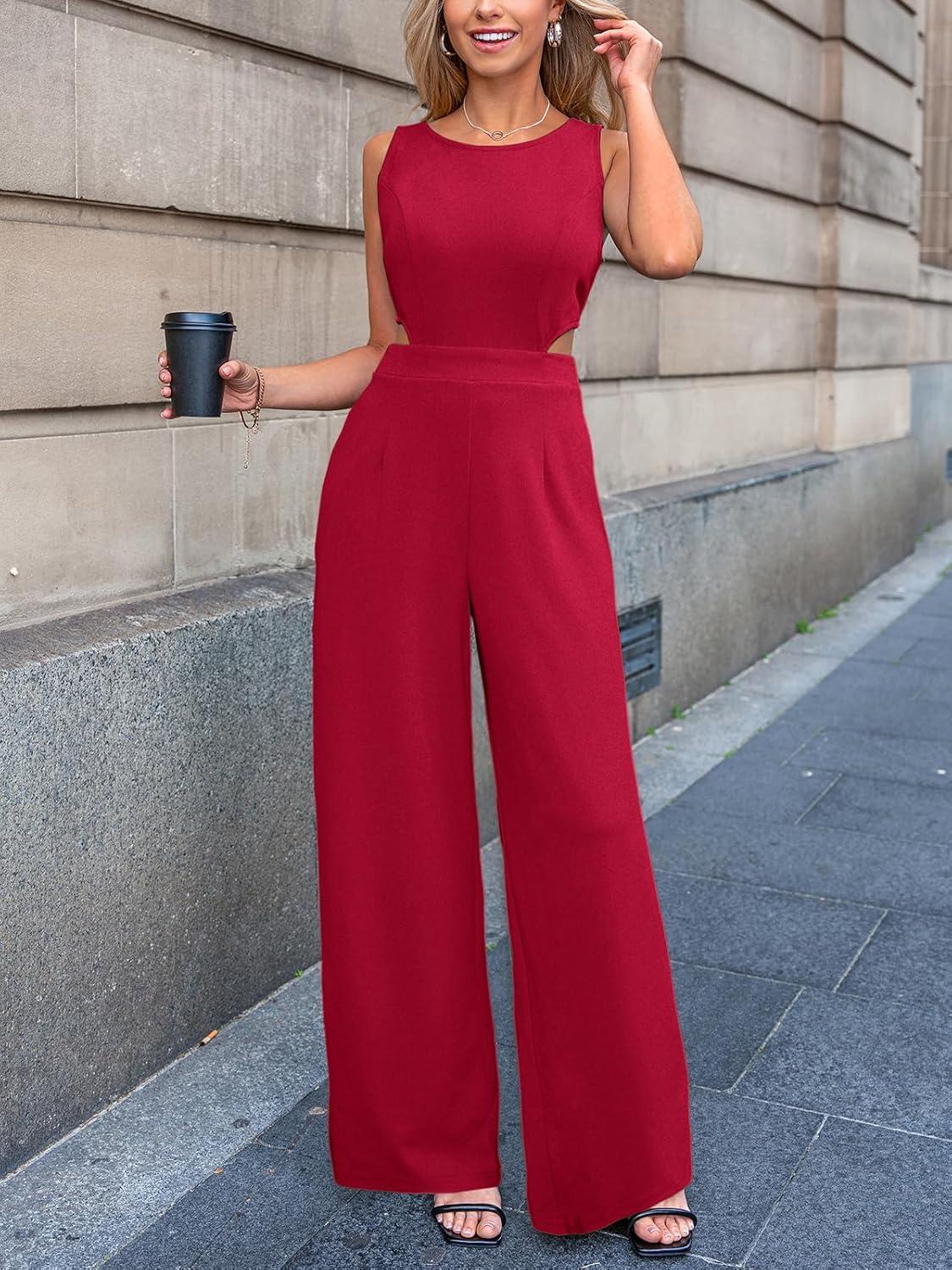 CUPSHE Women’s Romper Sleeveless Crew Neck Waist Cutout Wide Leg Maxi Jumpsuit Outfit Casual Dressy(Red)