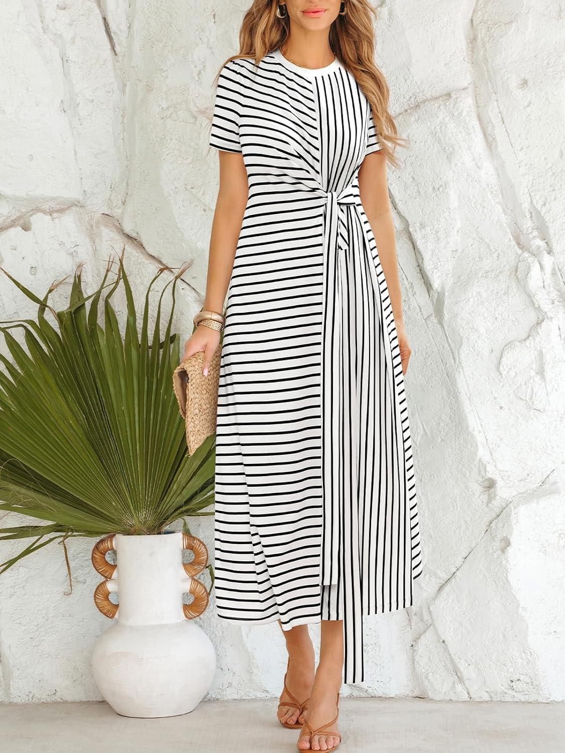CUPSHE Women’s Summer Striped Dresses Short Sleeve Tie Waist T Shirt Maxi Dress Casual Vacation Outfits(Black)