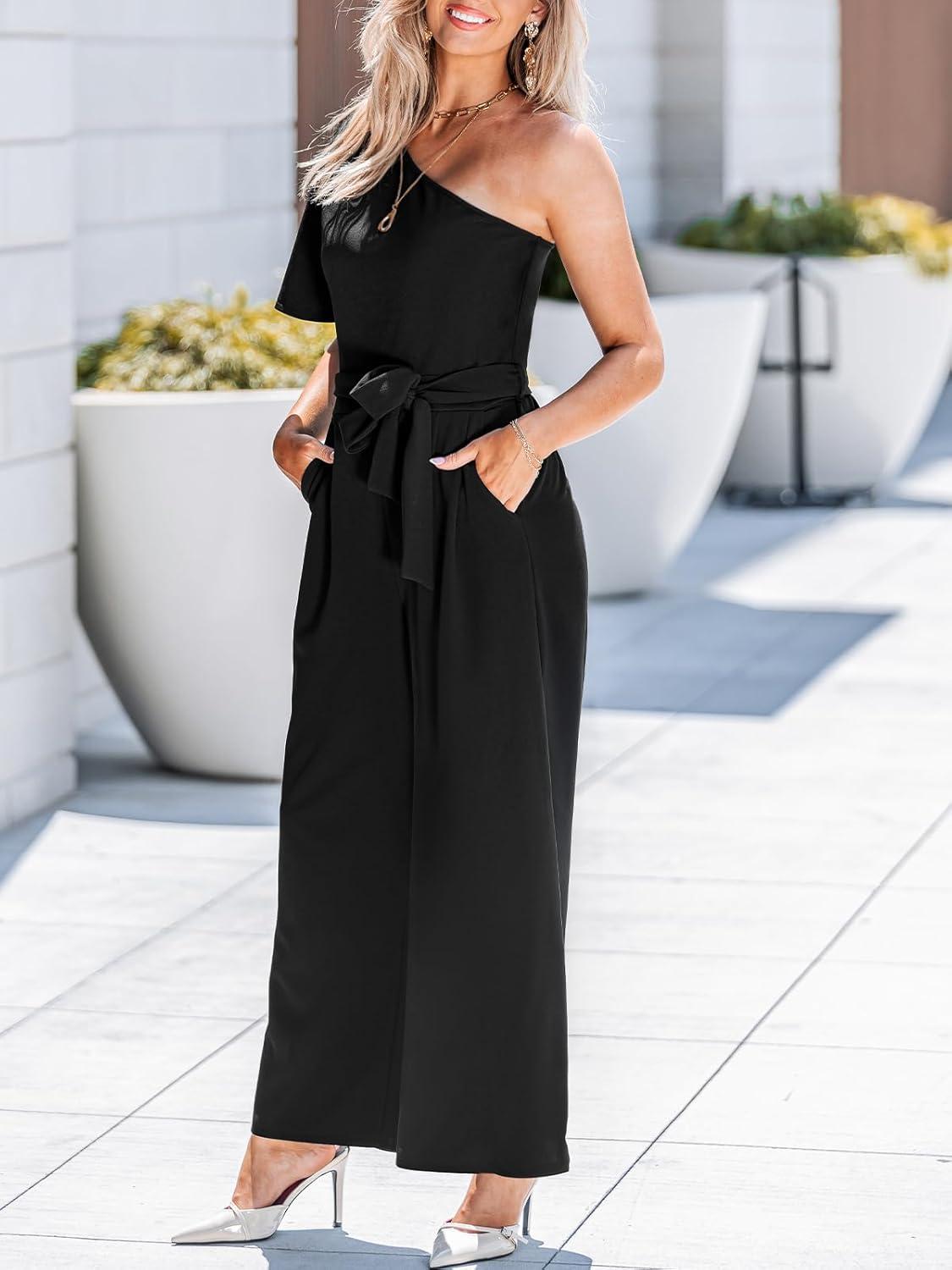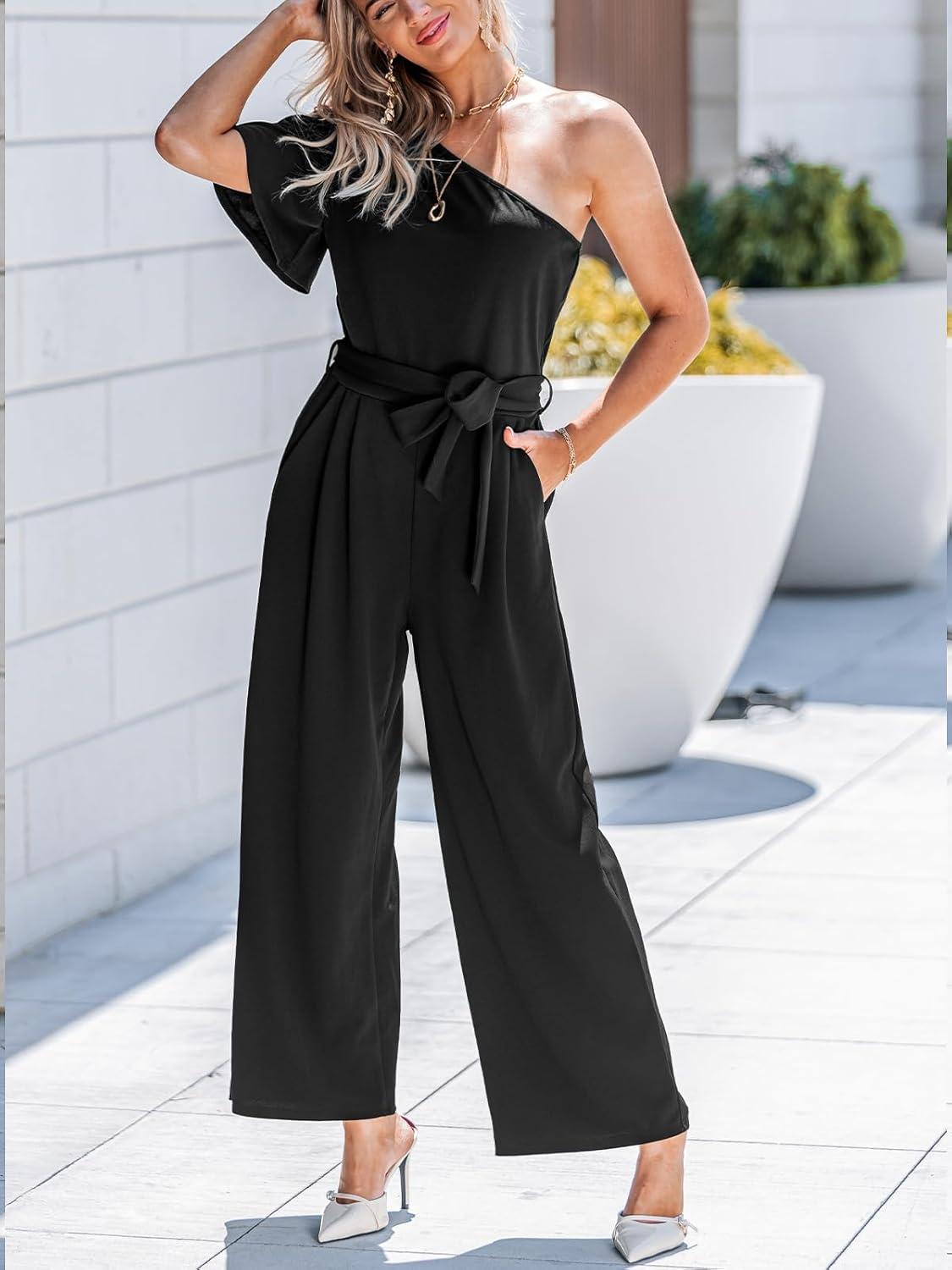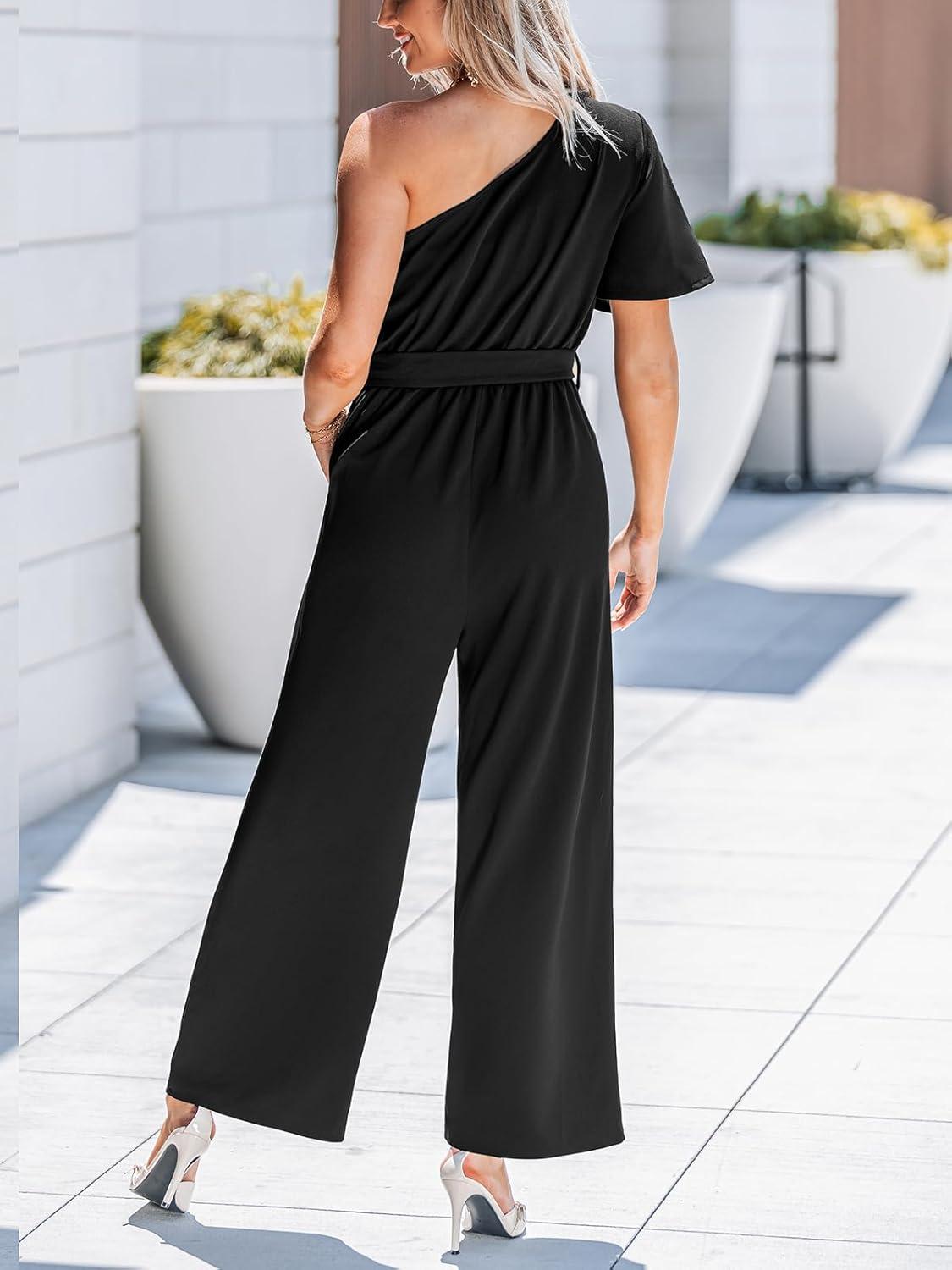 CUPSHE Women’s One Shoulder Jumpsuits Dressy One Piece Short Sleeve Belted Wide Leg Long Pants Jumpsuit(Black)