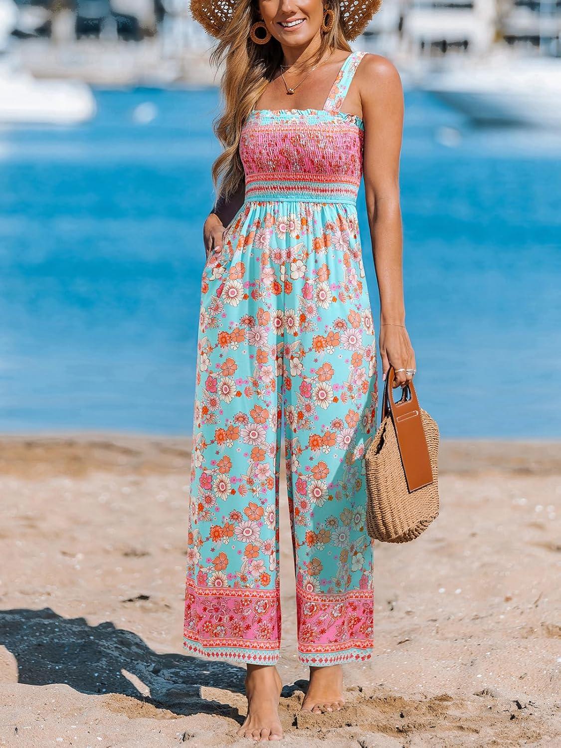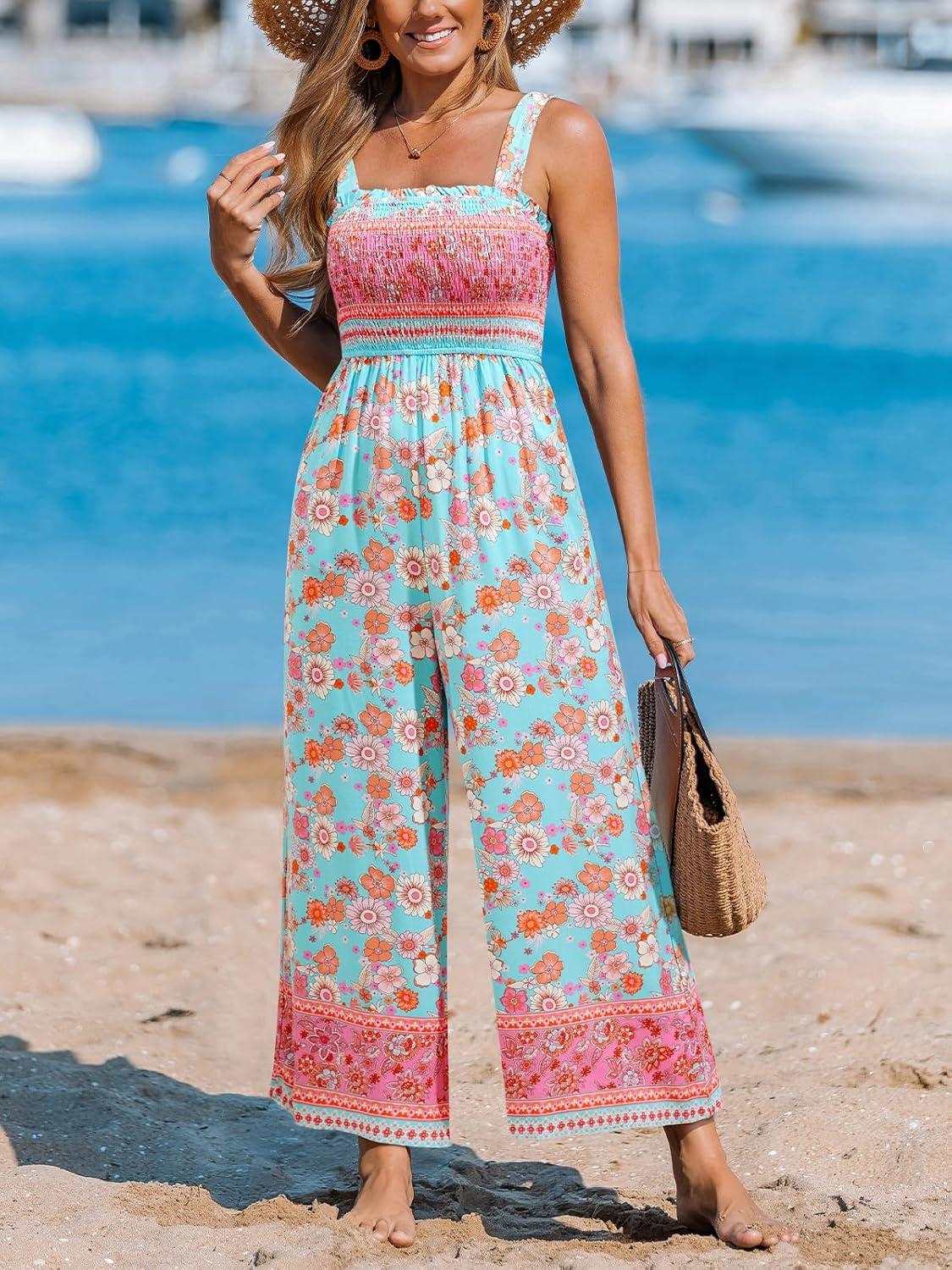 CUPSHE Women’s Summer Jumpsuit Disty Floral Elastic High Waist Sleeveless Wide Leg Beach Vacation Boho Jumpsuit with Pockets(Mint)