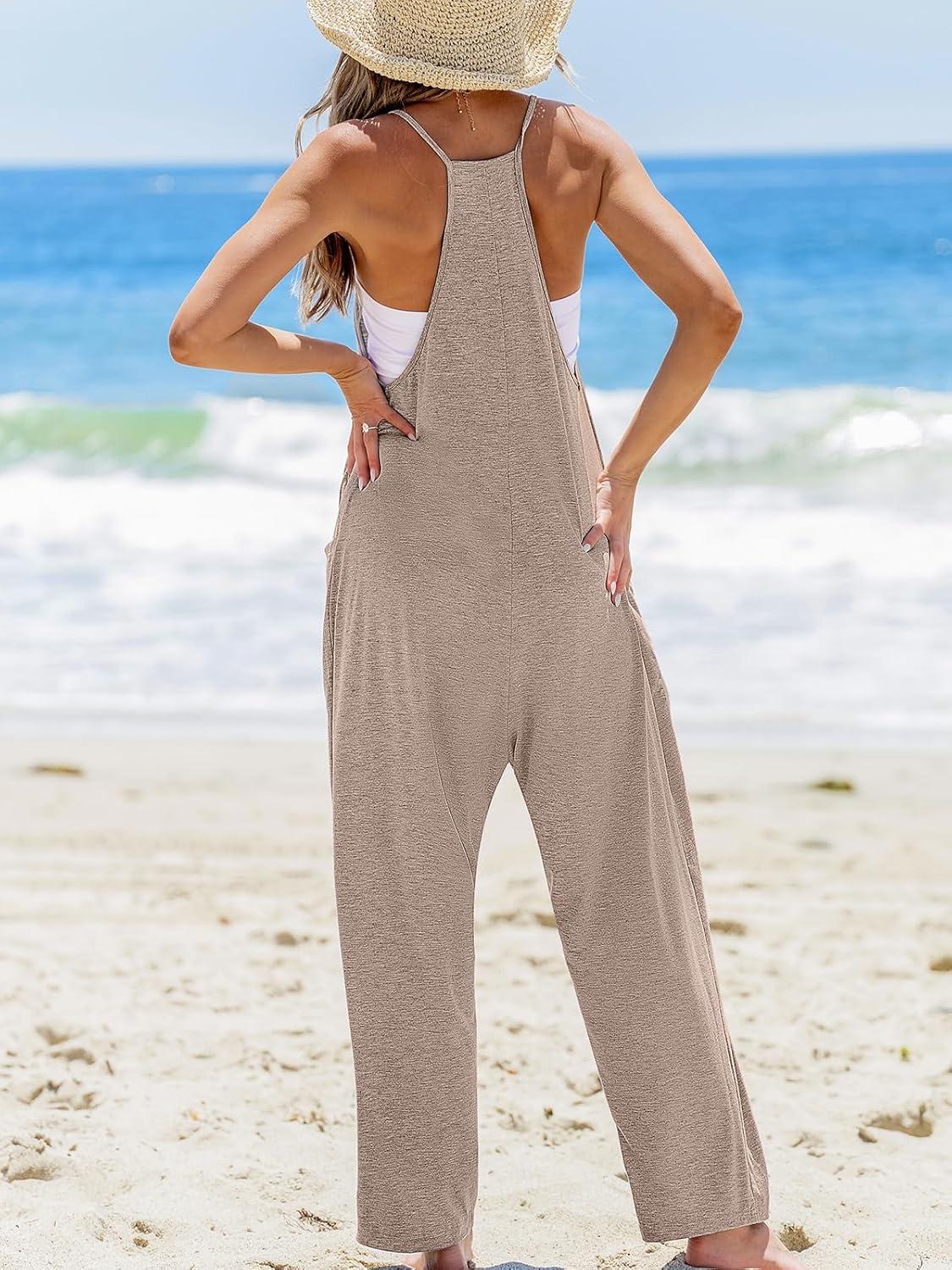 CUPSHE Women’s Summer Jumpsuit Sleeveless Casual Loose Fit Knit Scoop Neck Wide Leg Pockets Long Romper One Piece Vacation(Khaki)