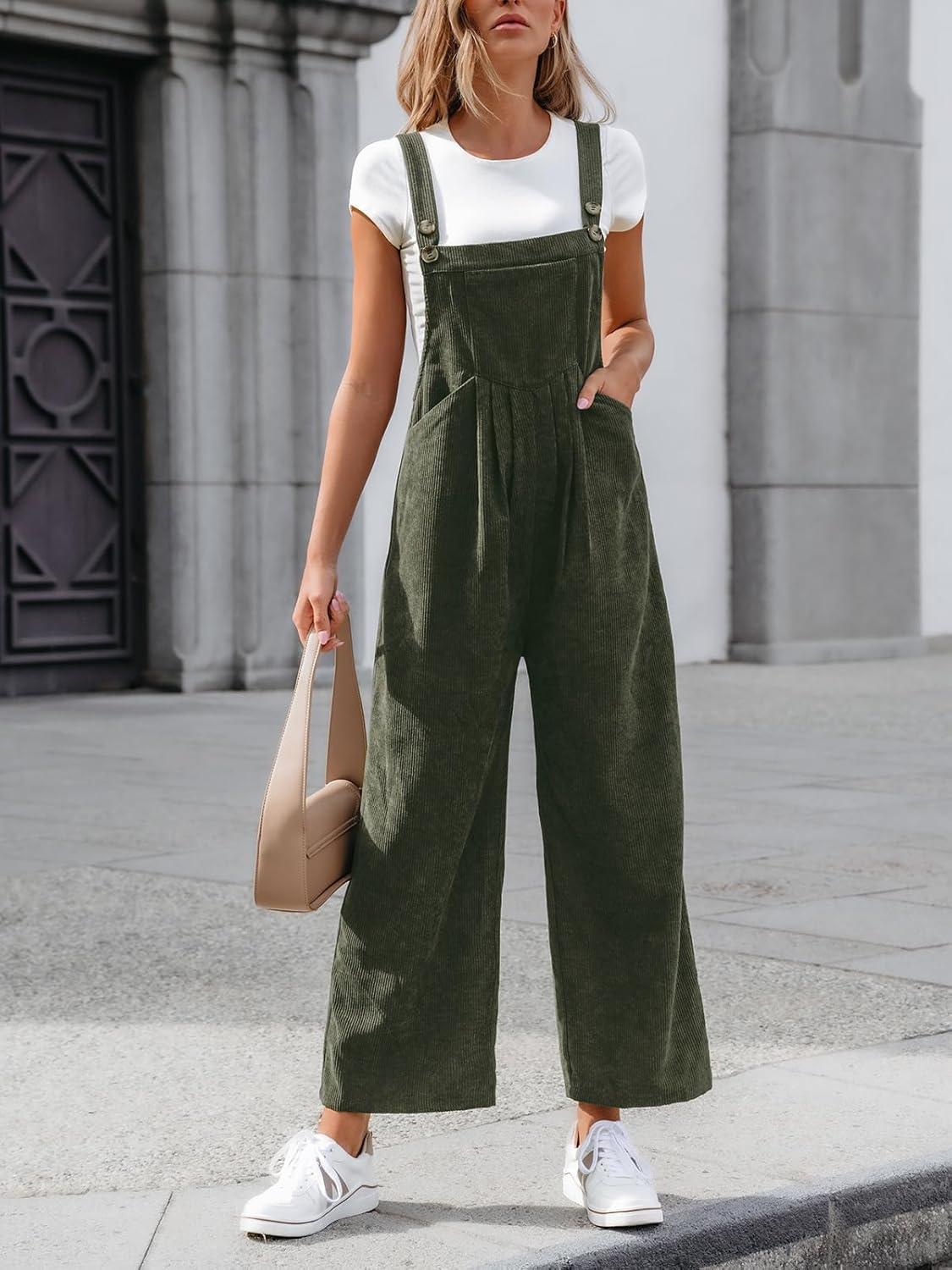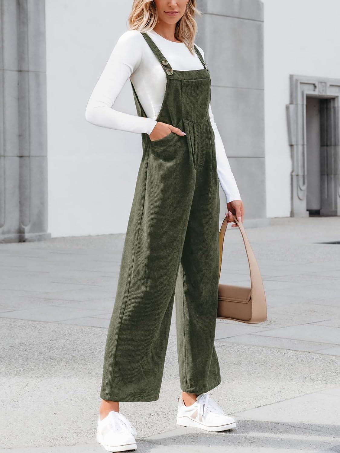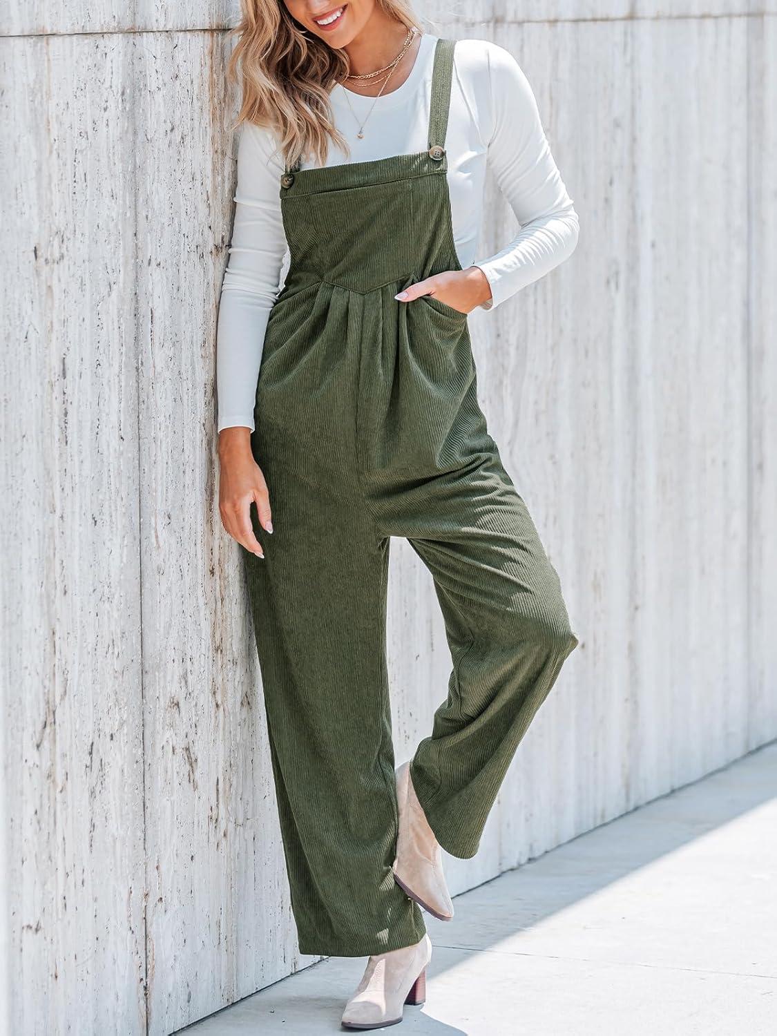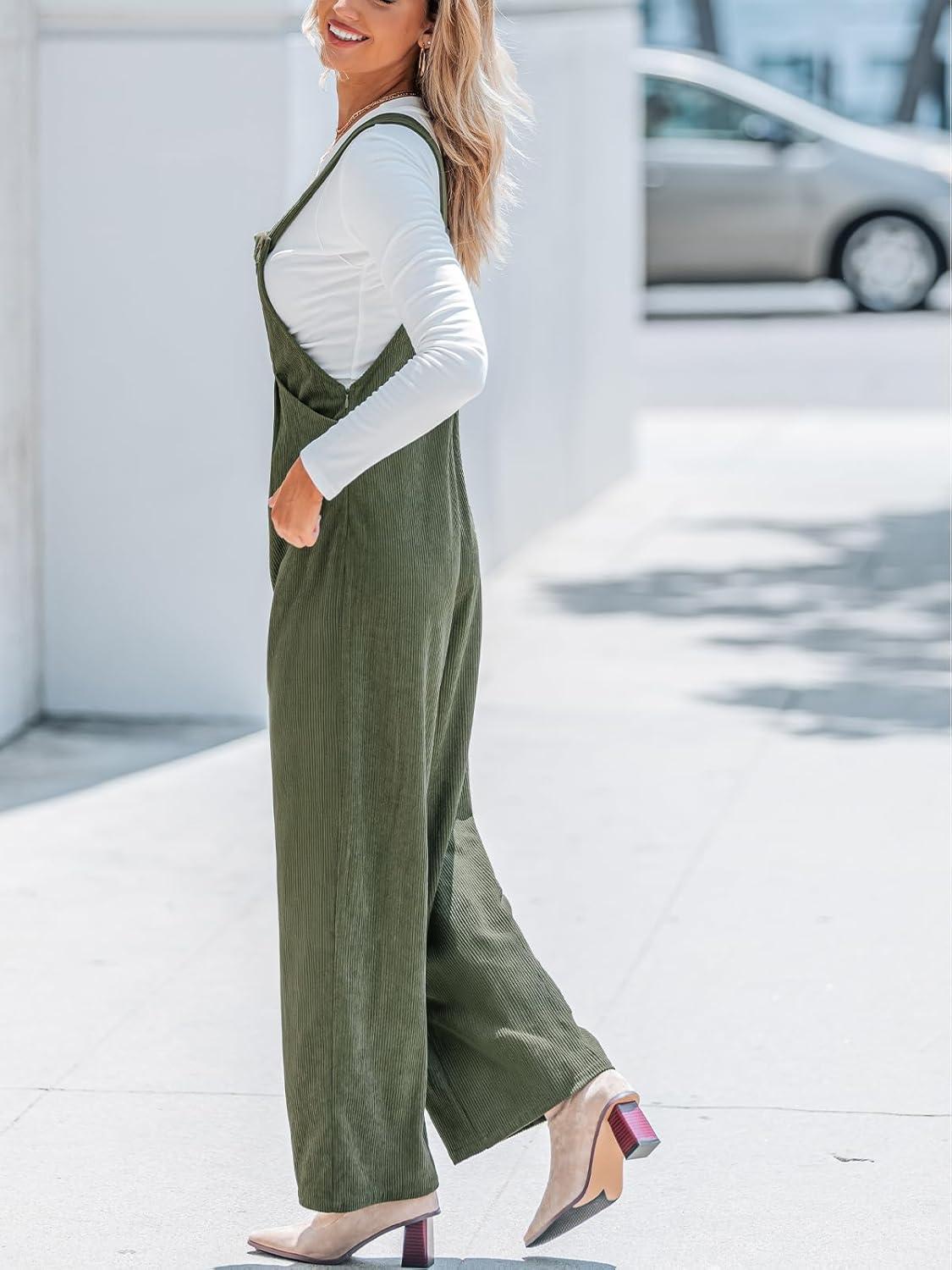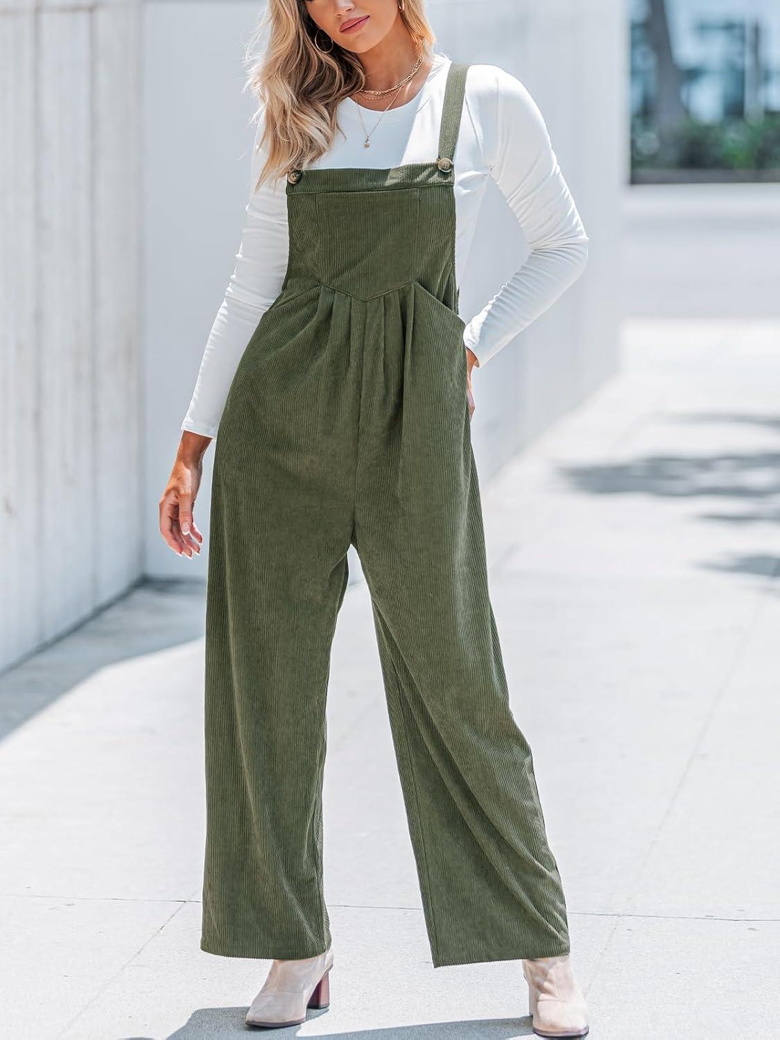 CUPSHE Womens Jumpsuit Corduroy Overalls Square Neck Sleeveless Wide Leg Jumpsuits Pockets Casual Outfit Loose Fall Romper(Green2)