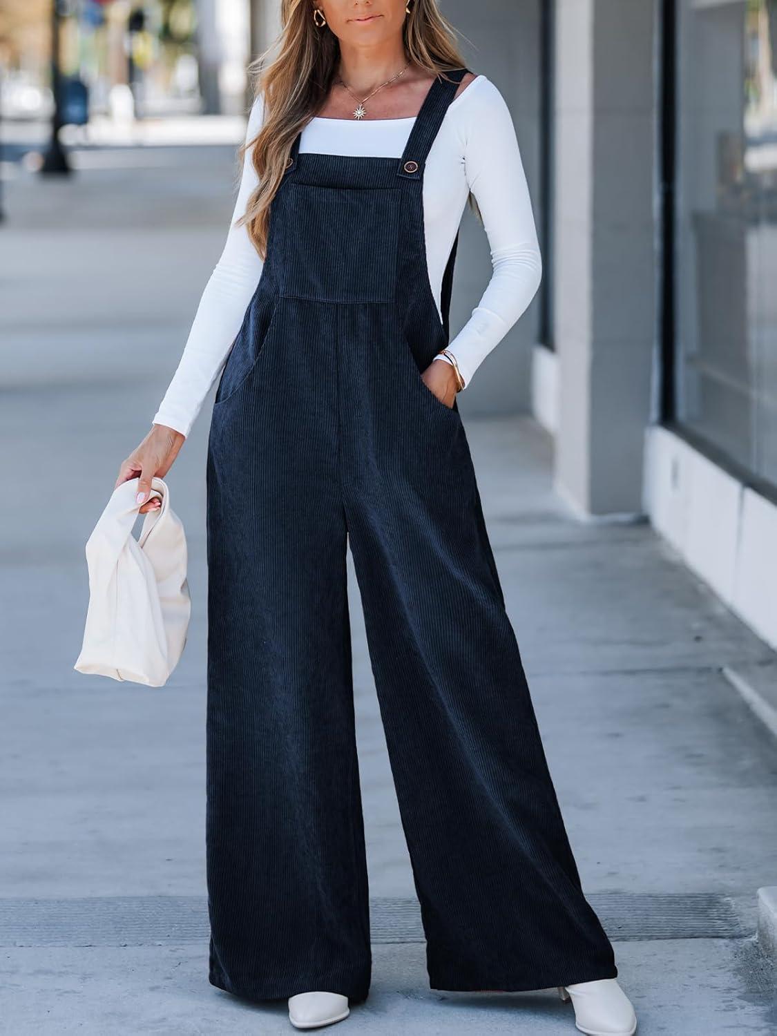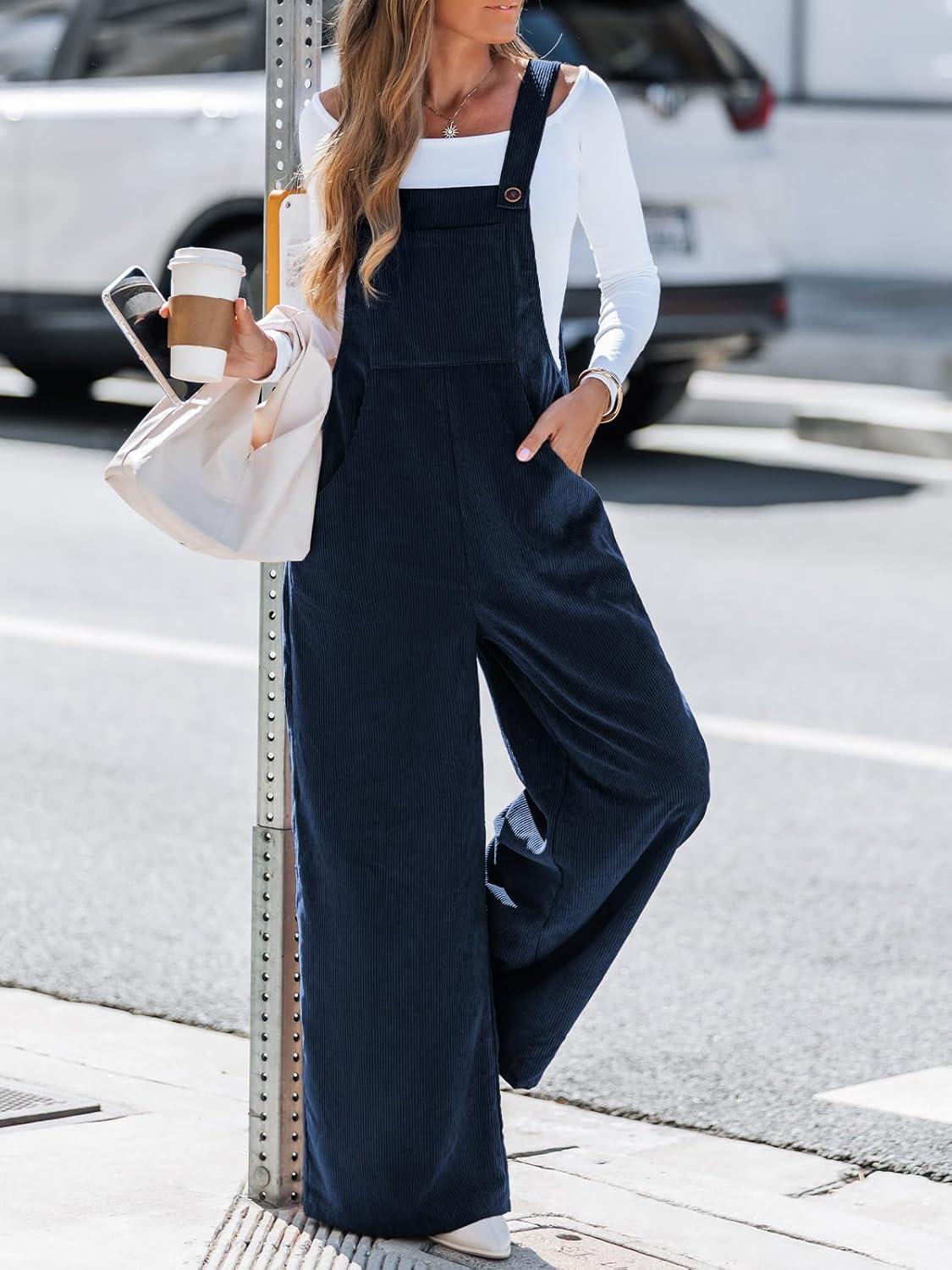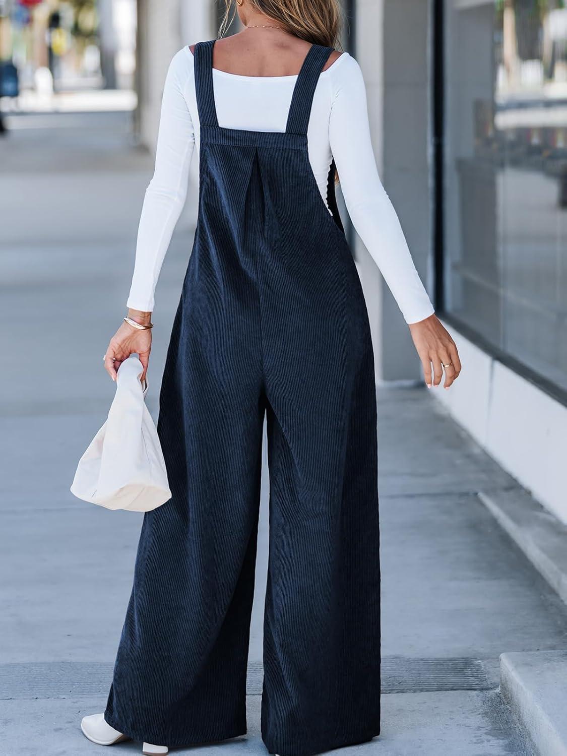 CUPSHE Womens Jumpsuit Corduroy Overalls Square Neck Sleeveless Wide Leg Jumpsuits Pockets Casual Outfit Loose Fall Romper(Navy)