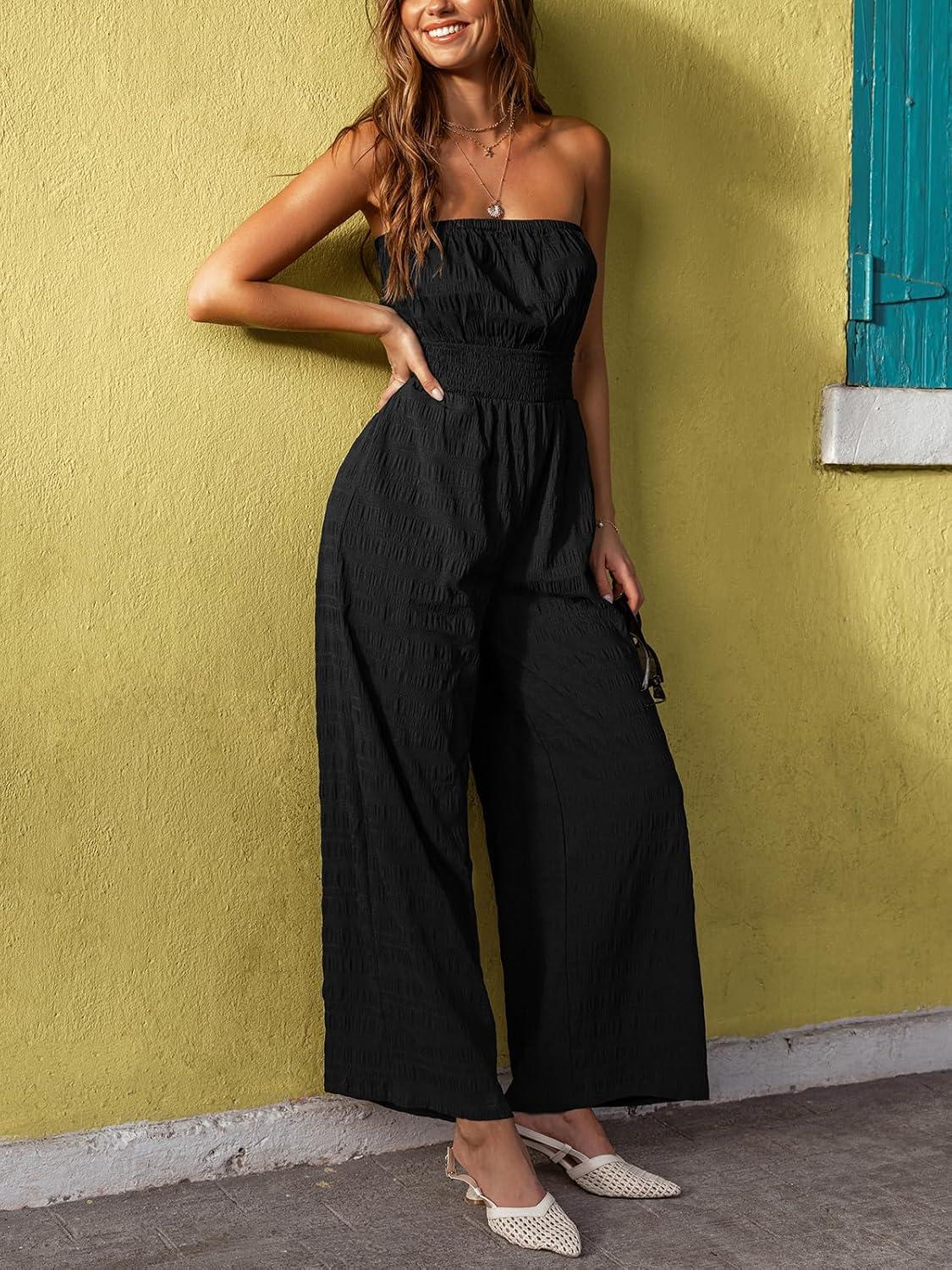 CUPSHE Womens Jumpsuit,Straight Neck Sleeveless Smocked Waist Wide Leg Outfit Casual Dressy for Summer Vacation Beach(Black)