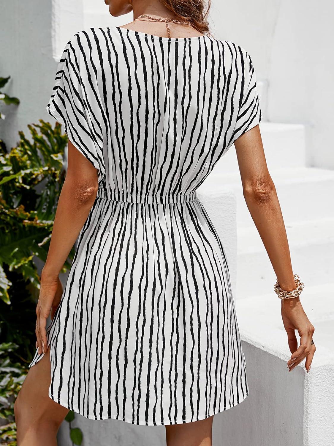 CUPSHE Women’s Swimsuit Coverup Casual V Neck Beach Dress Short Sleeve Elastic Waist Swimwear Cover Ups 2026 Beachwear(Black Stripes)