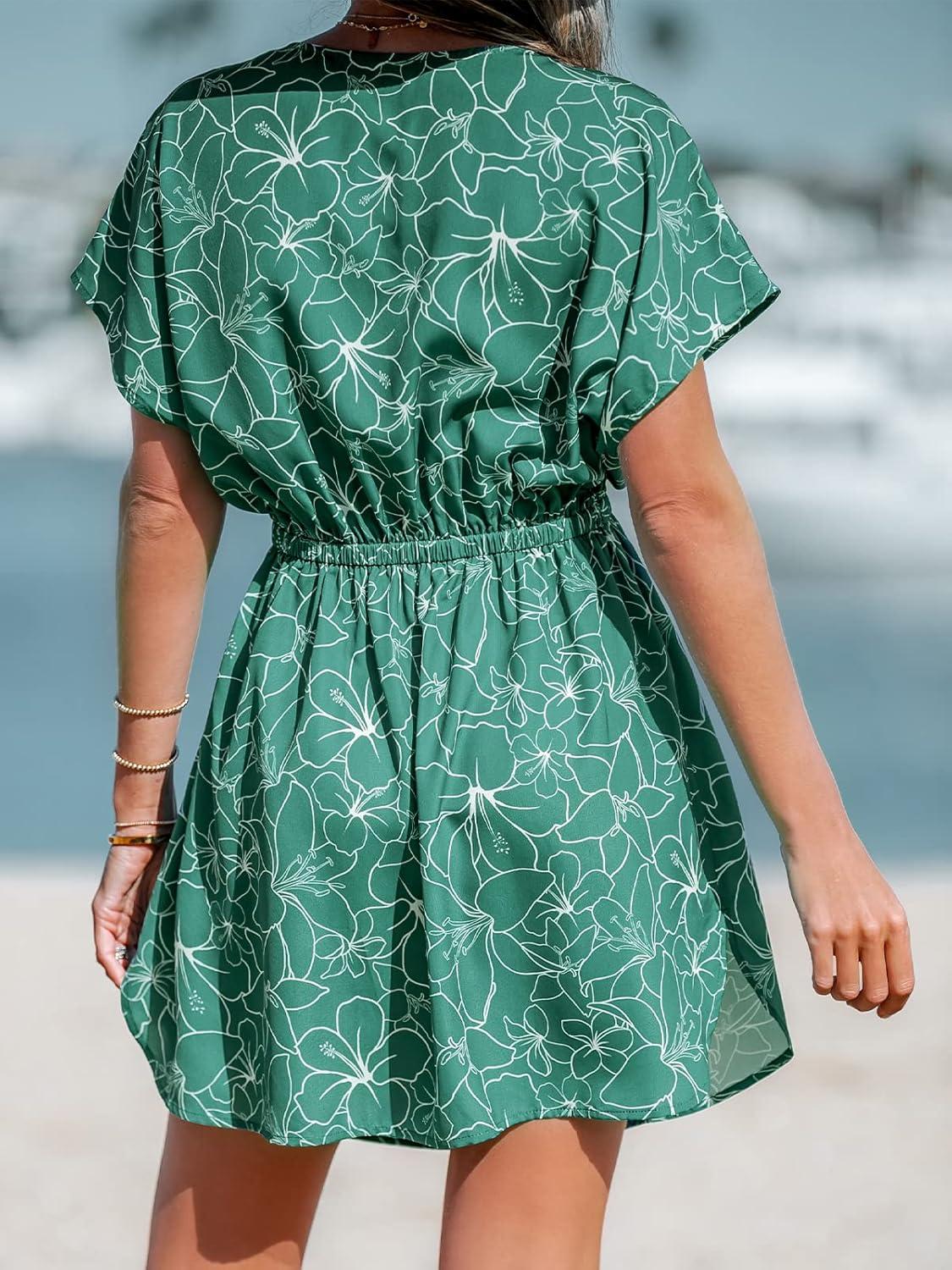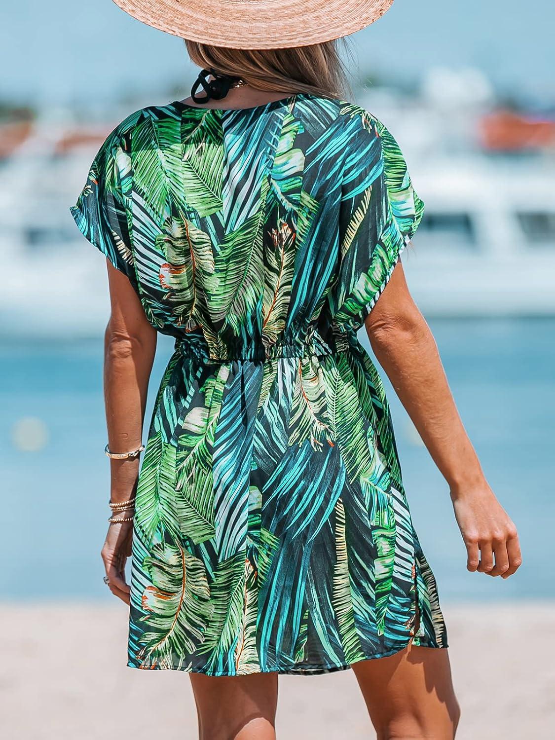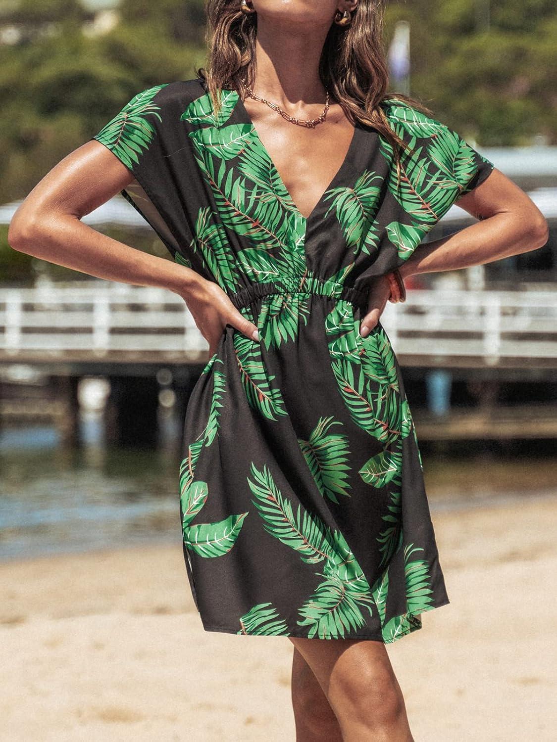 CUPSHE Women’s Swimsuit Coverup Casual V Neck Beach Dress Short Sleeve Elastic Waist Swimwear Cover Ups 2026 Beachwear(Green Leaf)
