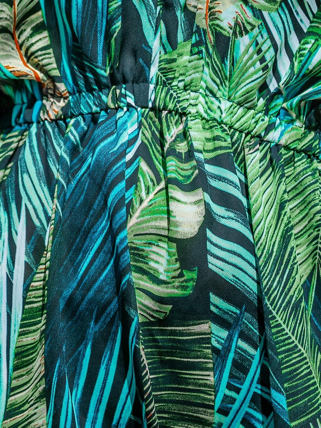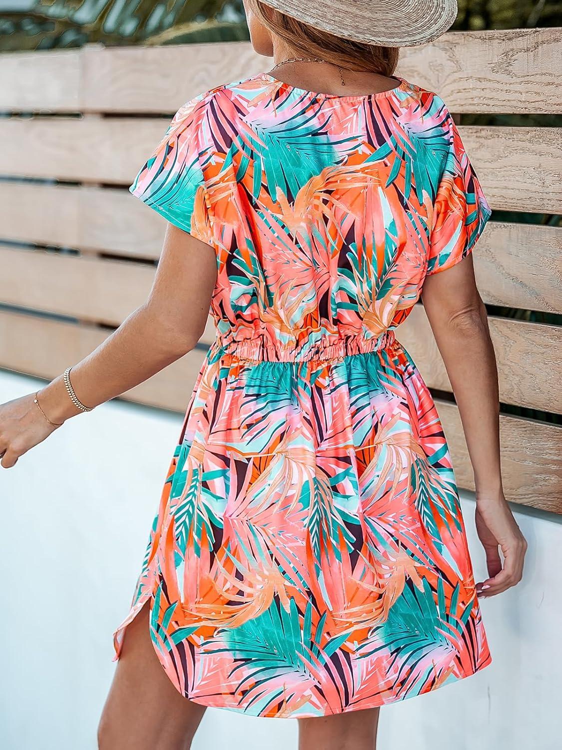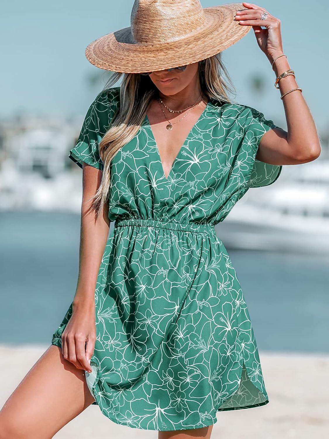 CUPSHE Women’s Swimsuit Coverup Casual V Neck Beach Dress Short Sleeve Elastic Waist Swimwear Cover Ups 2026 Beachwear(Green Leaf)