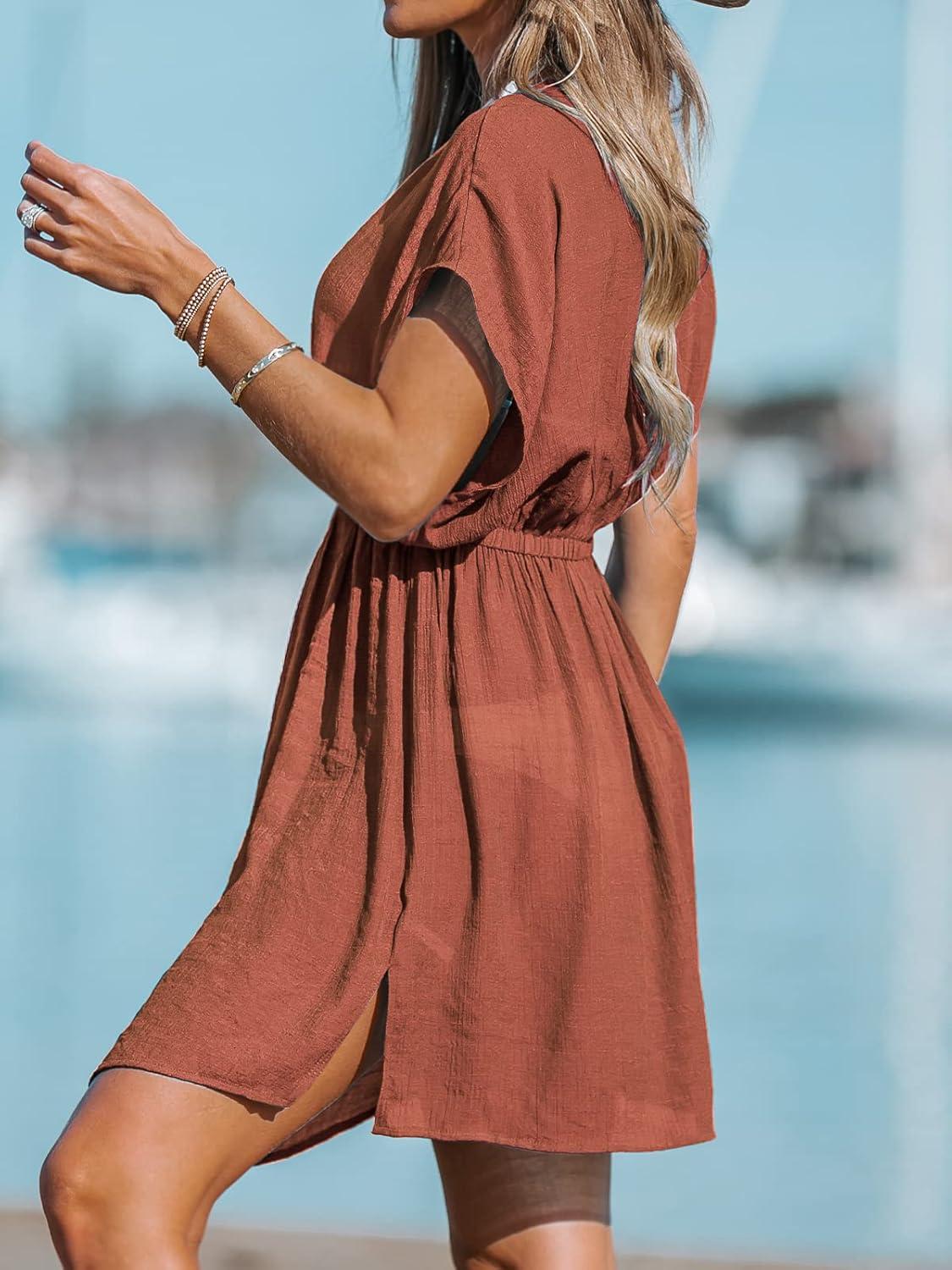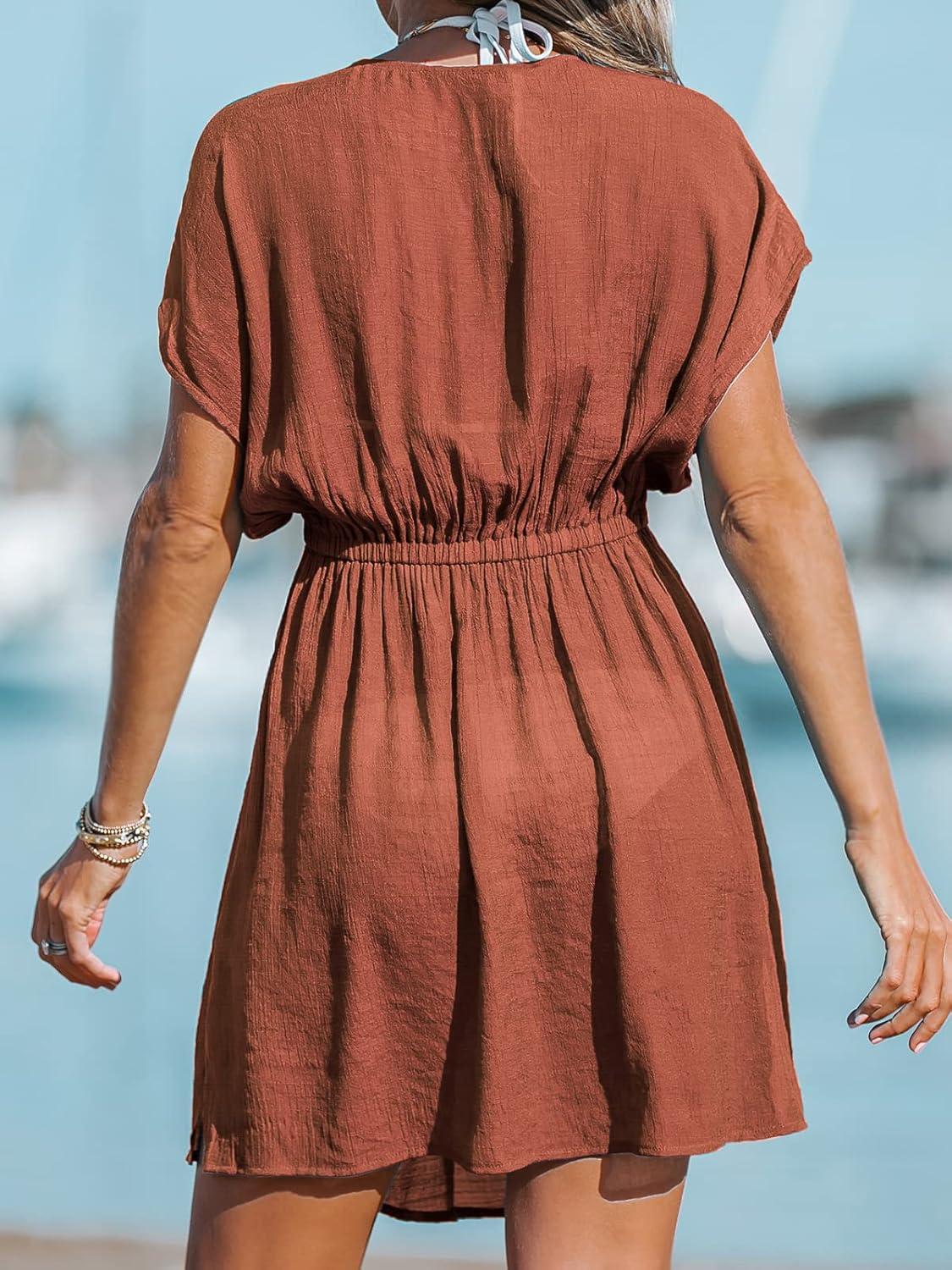 CUPSHE Women’s Swimsuit Coverup Casual V Neck Beach Dress Short Sleeve Elastic Waist Swimwear Cover Ups 2026 Beachwear(Burnt Orange)