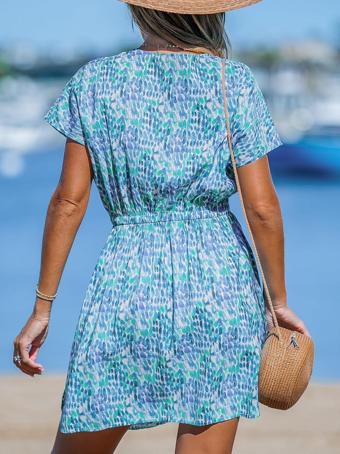 CUPSHE Women’s Swimsuit Coverup Casual V Neck Beach Dress Short Sleeve Elastic Waist Swimwear Cover Ups 2026 Beachwear(Green Dot)