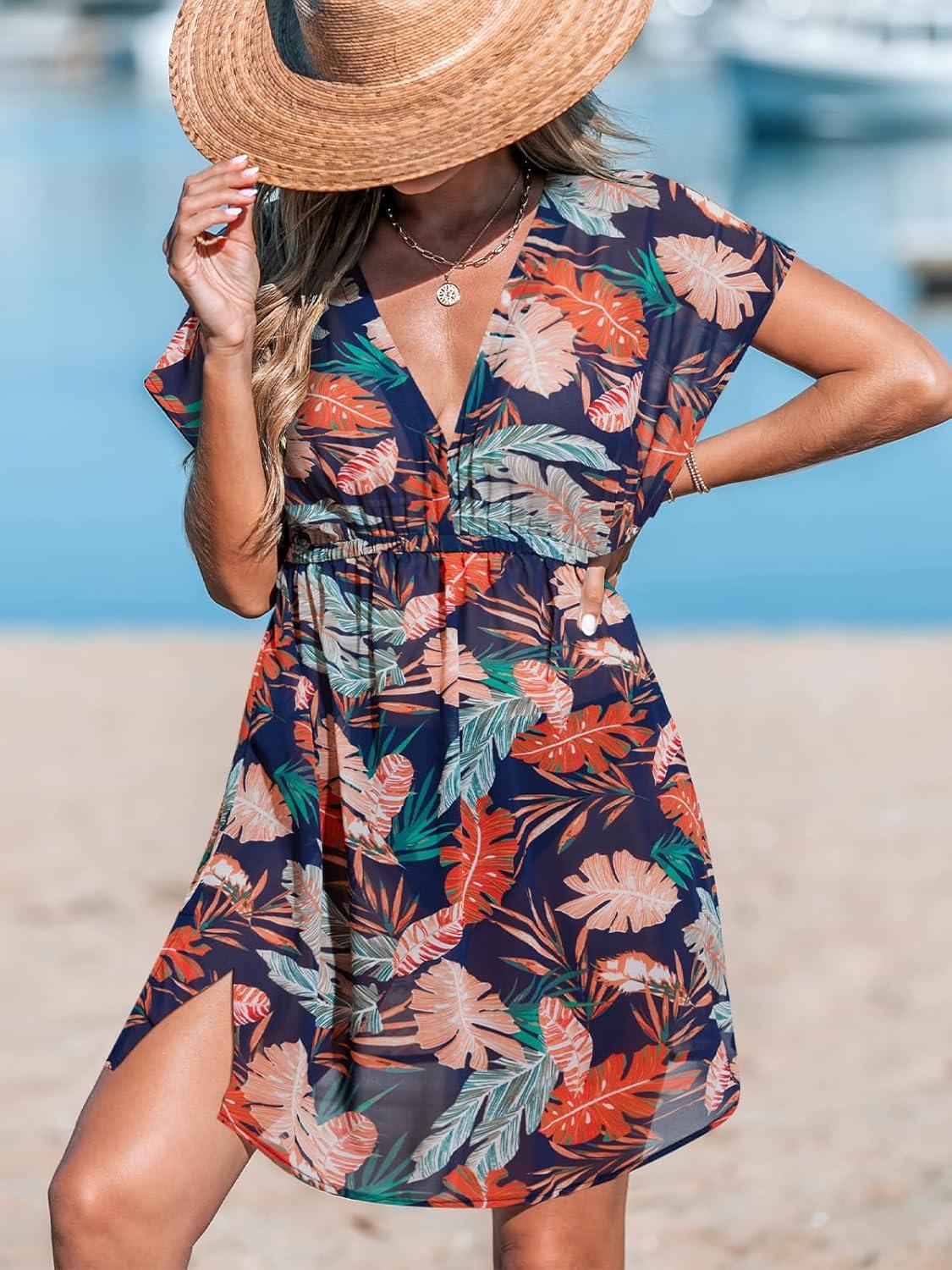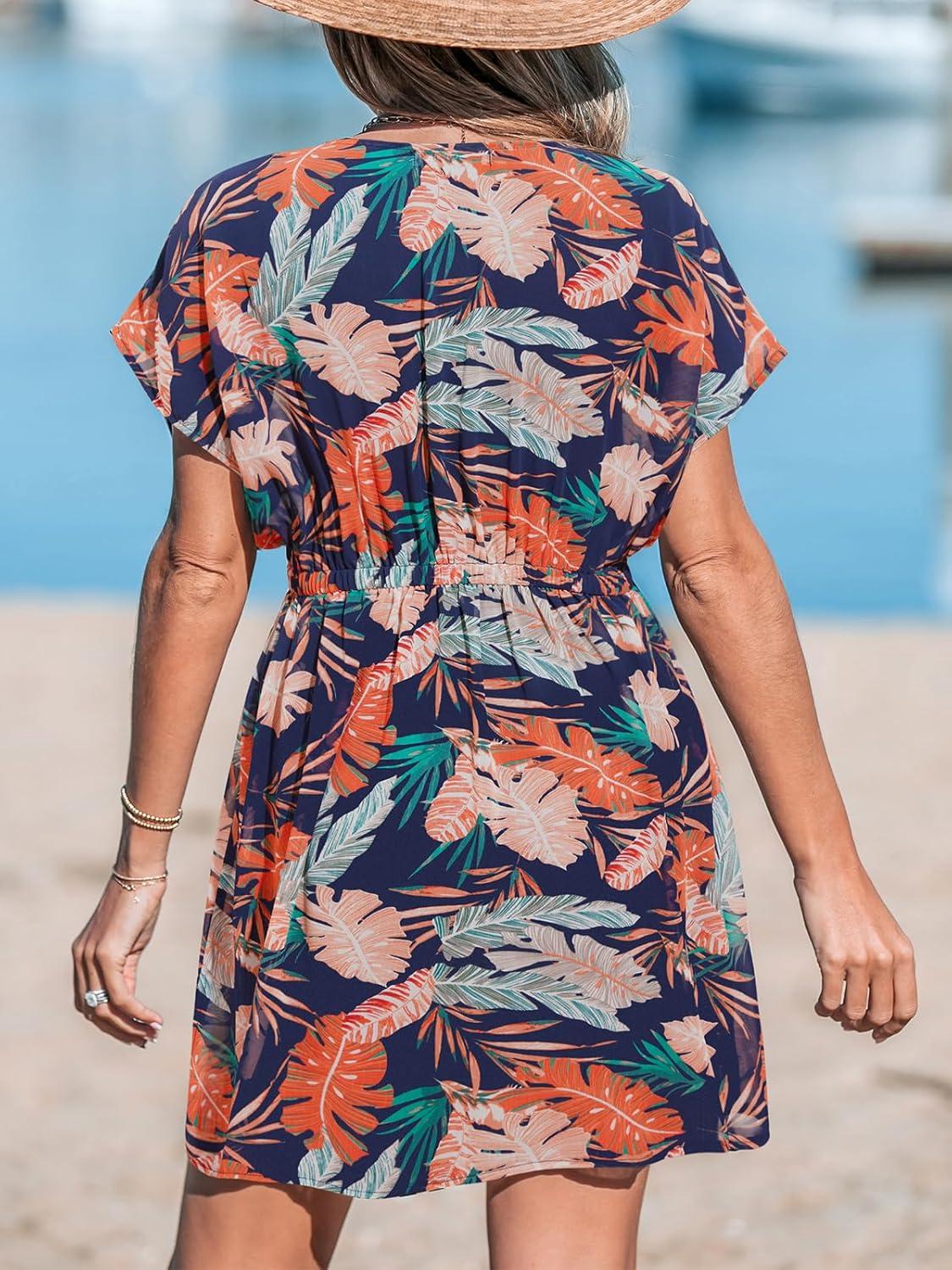 CUPSHE Women’s Swimsuit Coverup Casual V Neck Beach Dress Short Sleeve Elastic Waist Swimwear Cover Ups 2026 Beachwear(Navy Leaf)