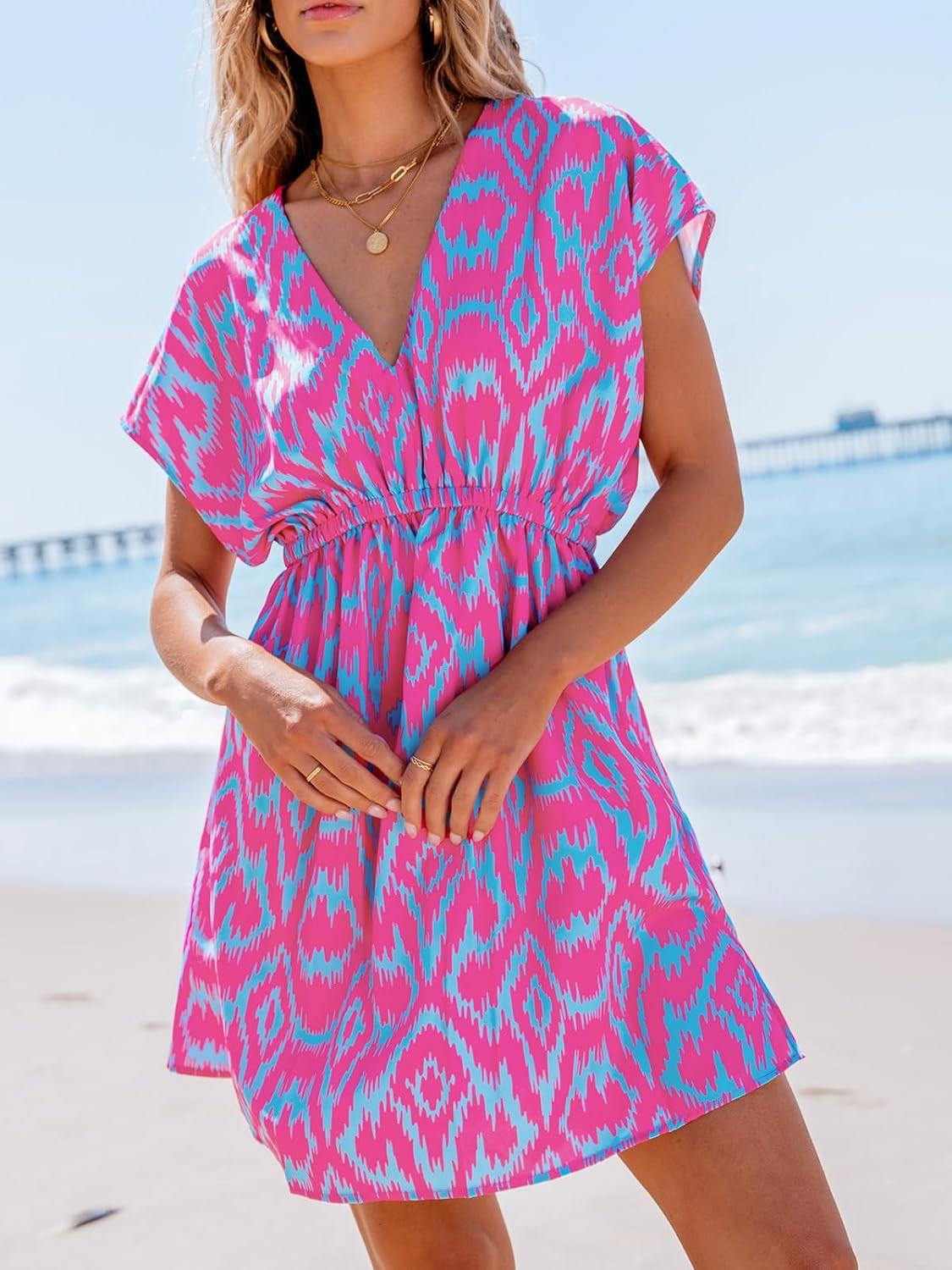 CUPSHE Women’s Swimsuit Coverup Casual V Neck Beach Dress Short Sleeve Elastic Waist Swimwear Cover Ups 2026 Beachwear(Flamingos)