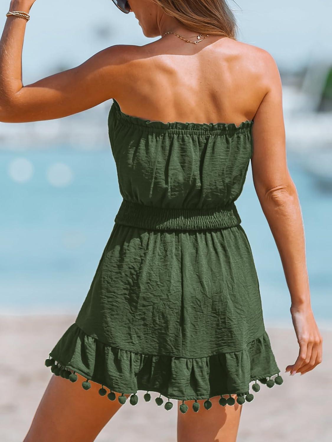 CUPSHE Women’s Swimsuit Coverup Strapless Tube Dress Smocked Pom Pom Casual Beach Sundress(Green)