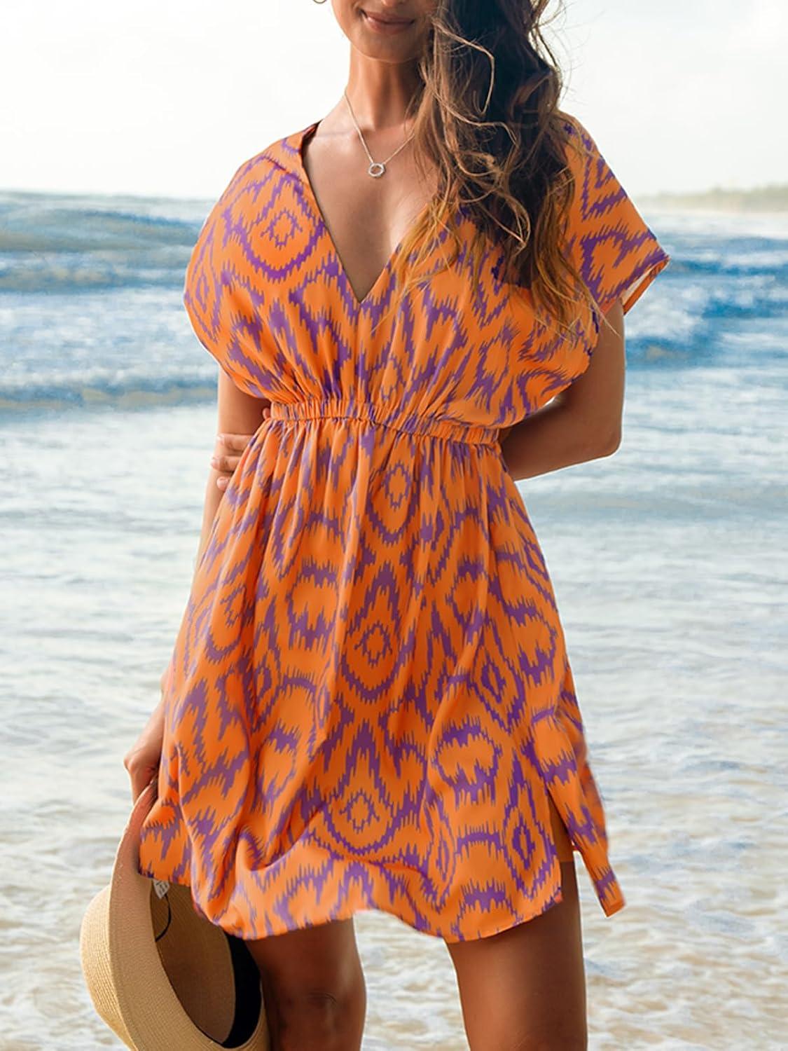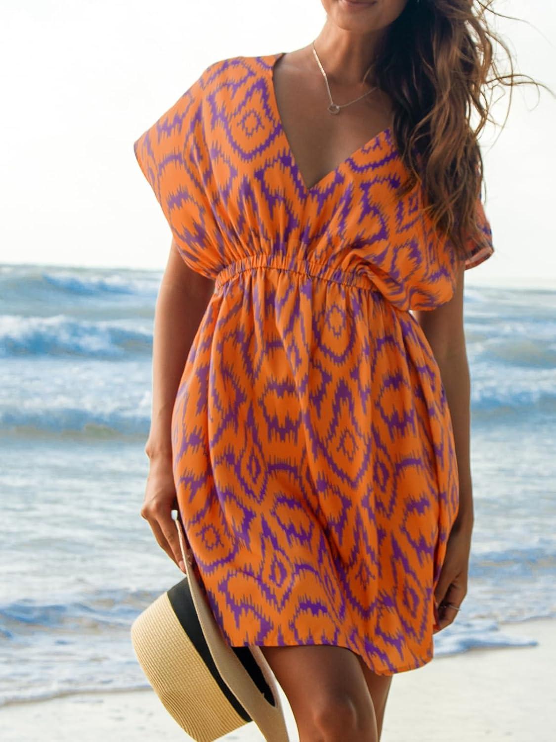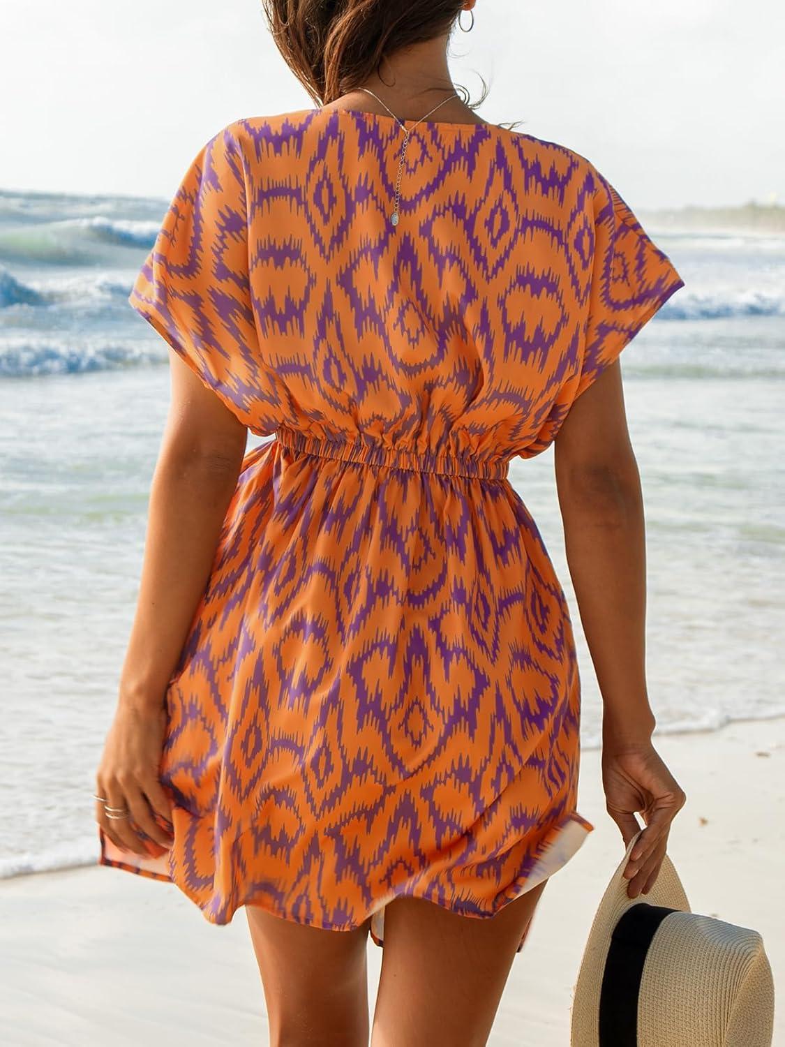 CUPSHE Women’s Swimsuit Coverup Casual V Neck Beach Dress Short Sleeve Elastic Waist Swimwear Cover Ups 2026 Beachwear(Orange Geometric)