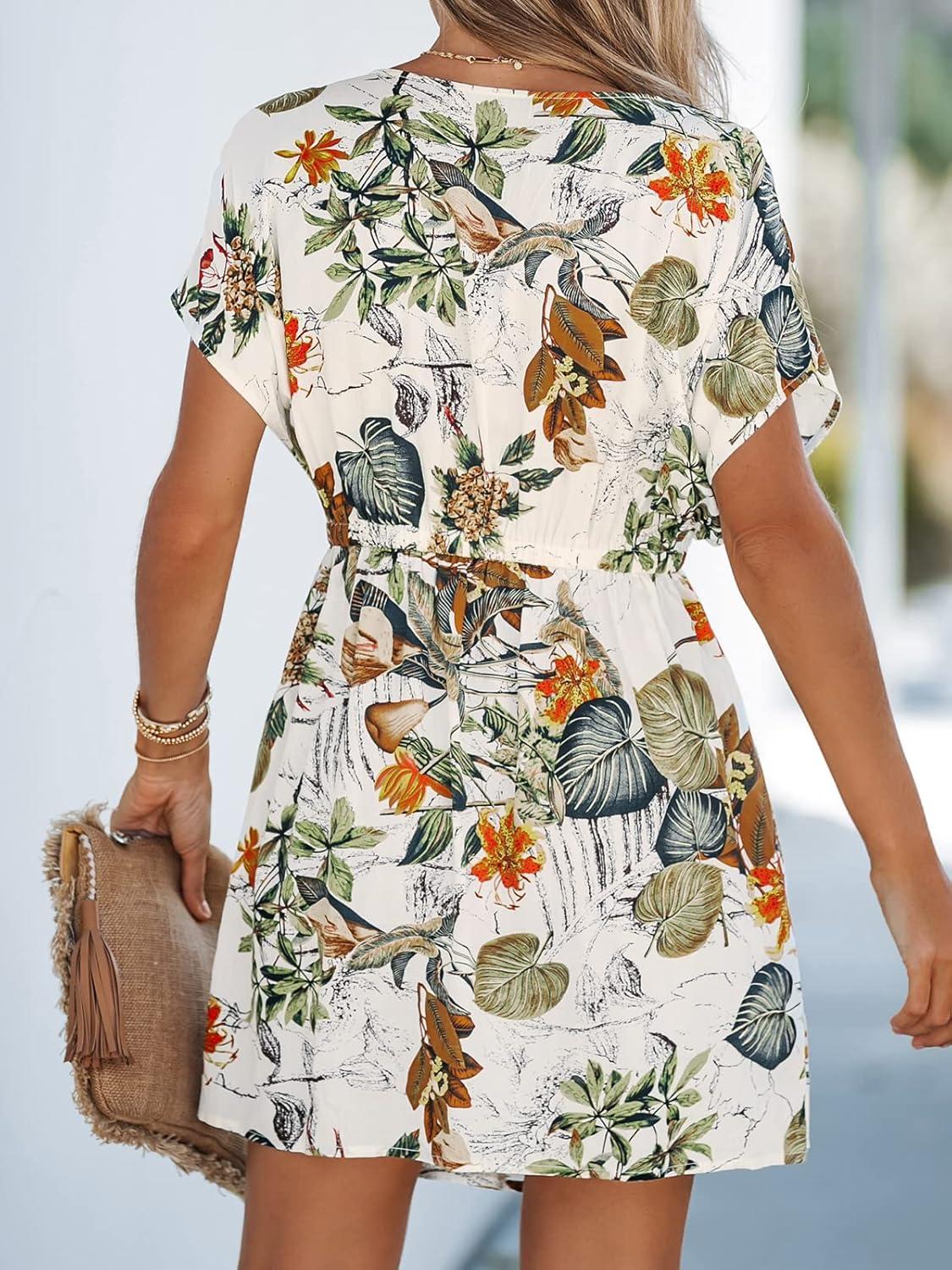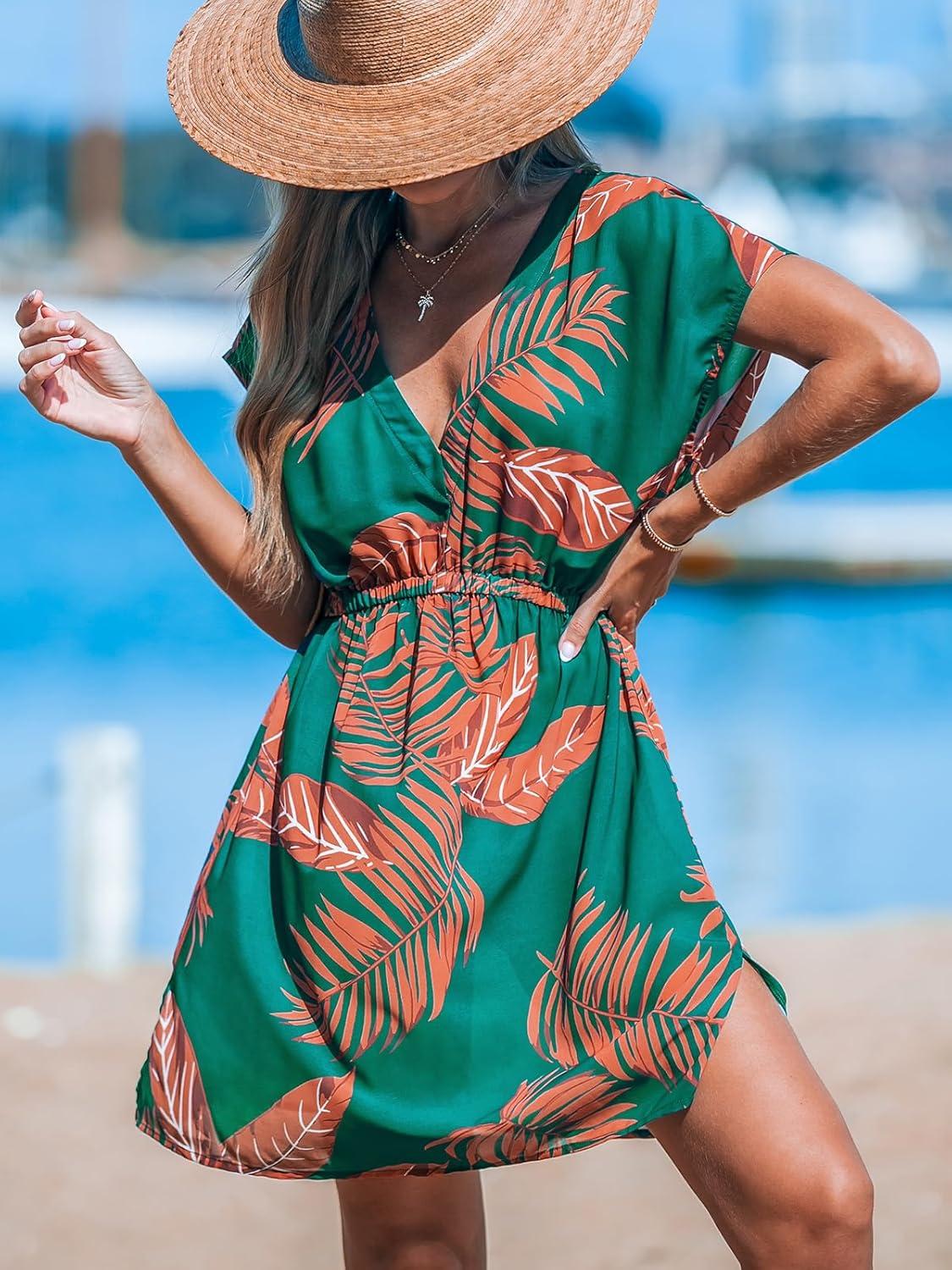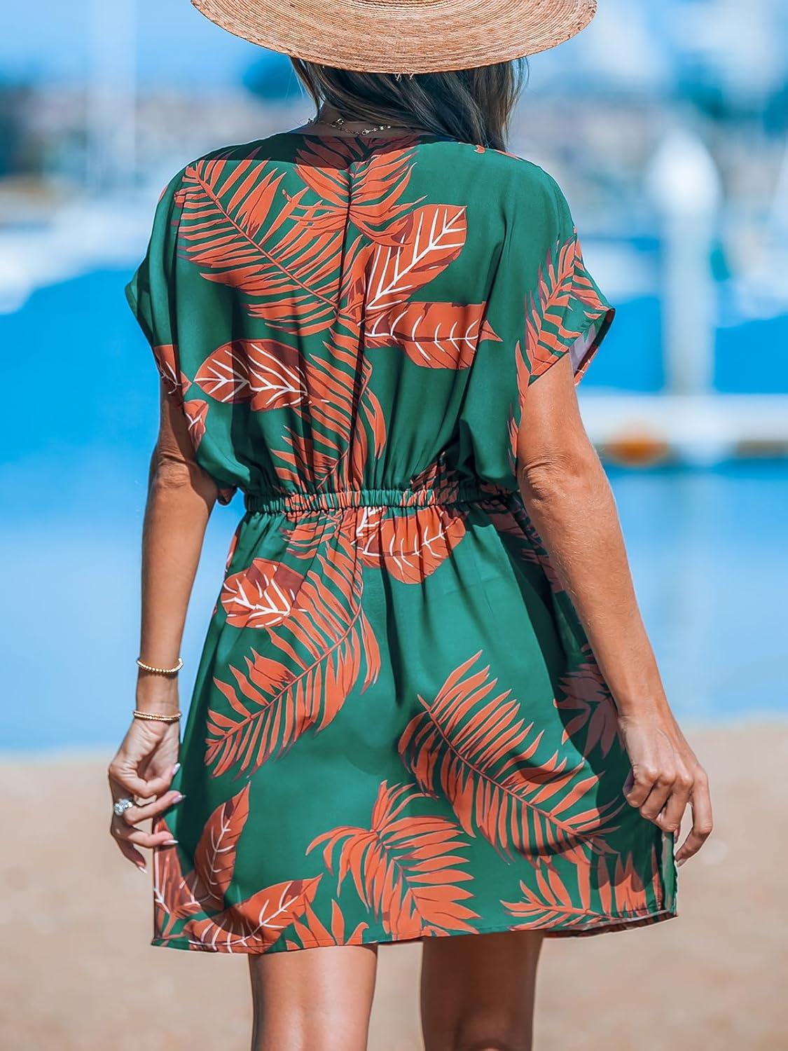CUPSHE Women’s Swimsuit Coverup Casual V Neck Beach Dress Short Sleeve Elastic Waist Swimwear Cover Ups 2026 Beachwear(Tropical Plant)