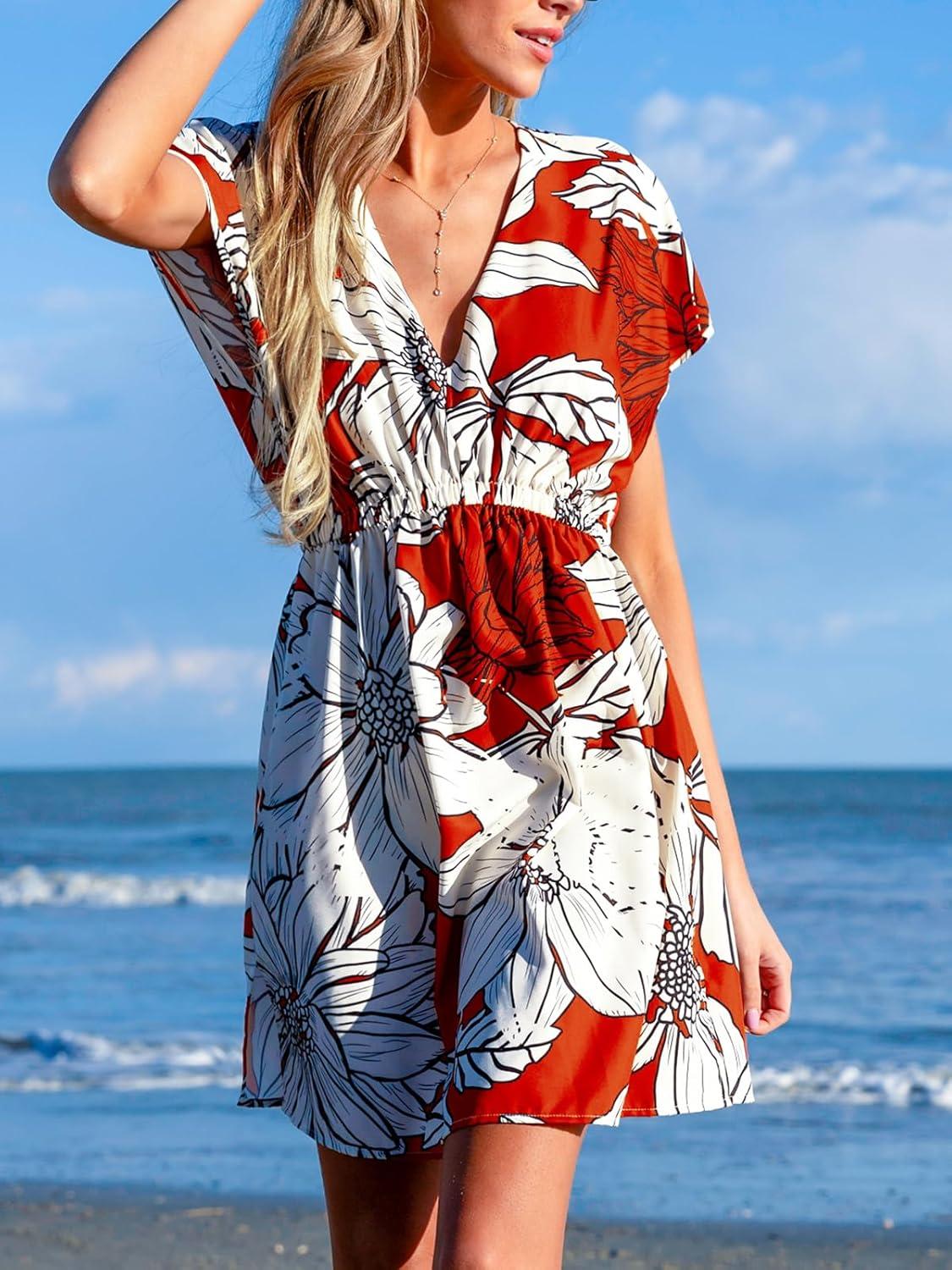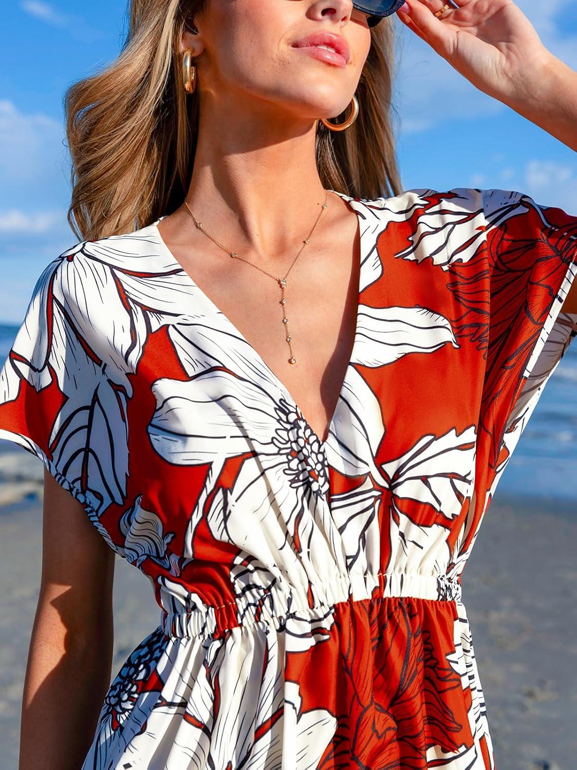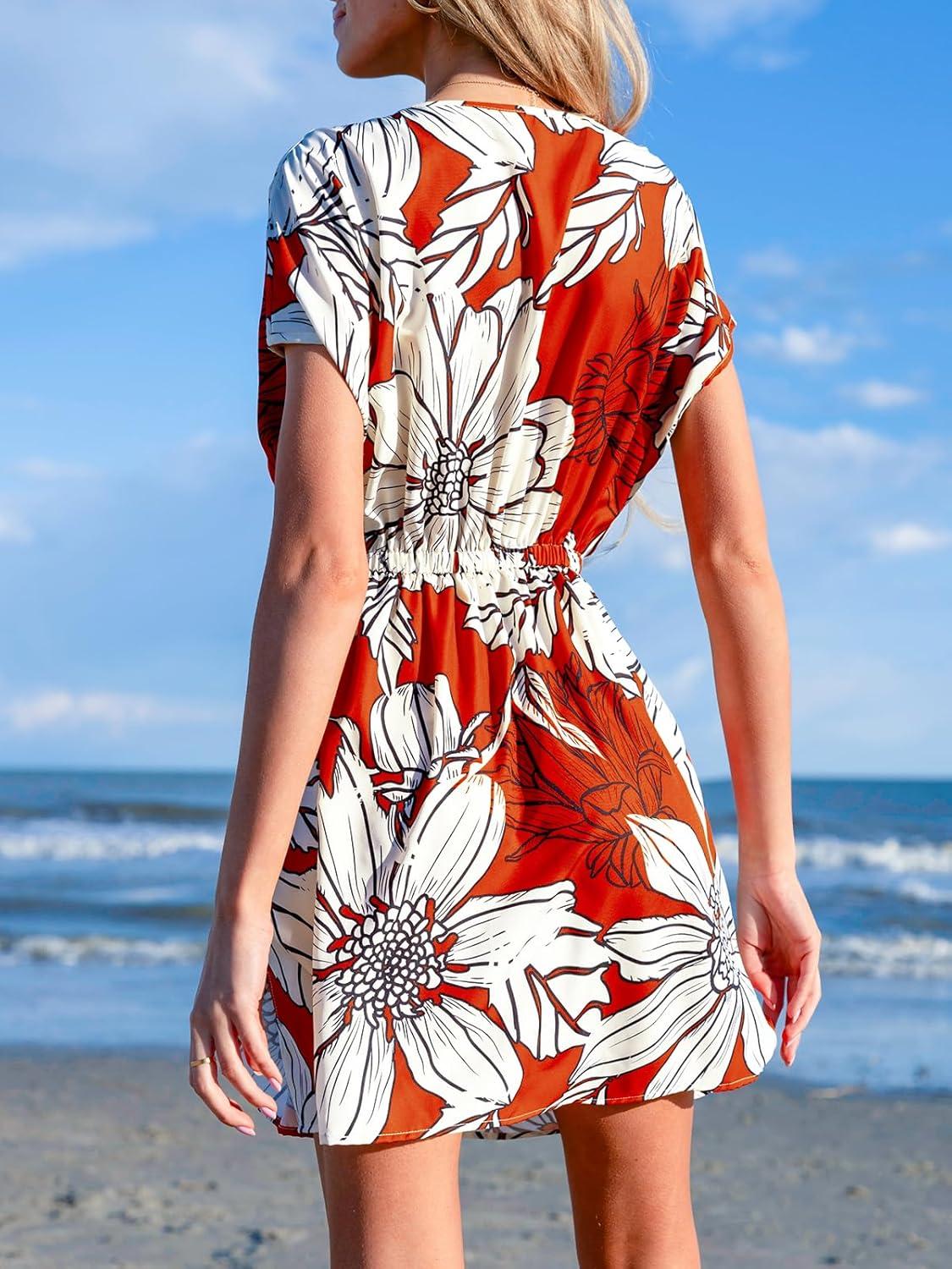 CUPSHE Women’s Swimsuit Coverup Casual V Neck Beach Dress Short Sleeve Elastic Waist Swimwear Cover Ups 2026 Beachwear(Orange Leaf)