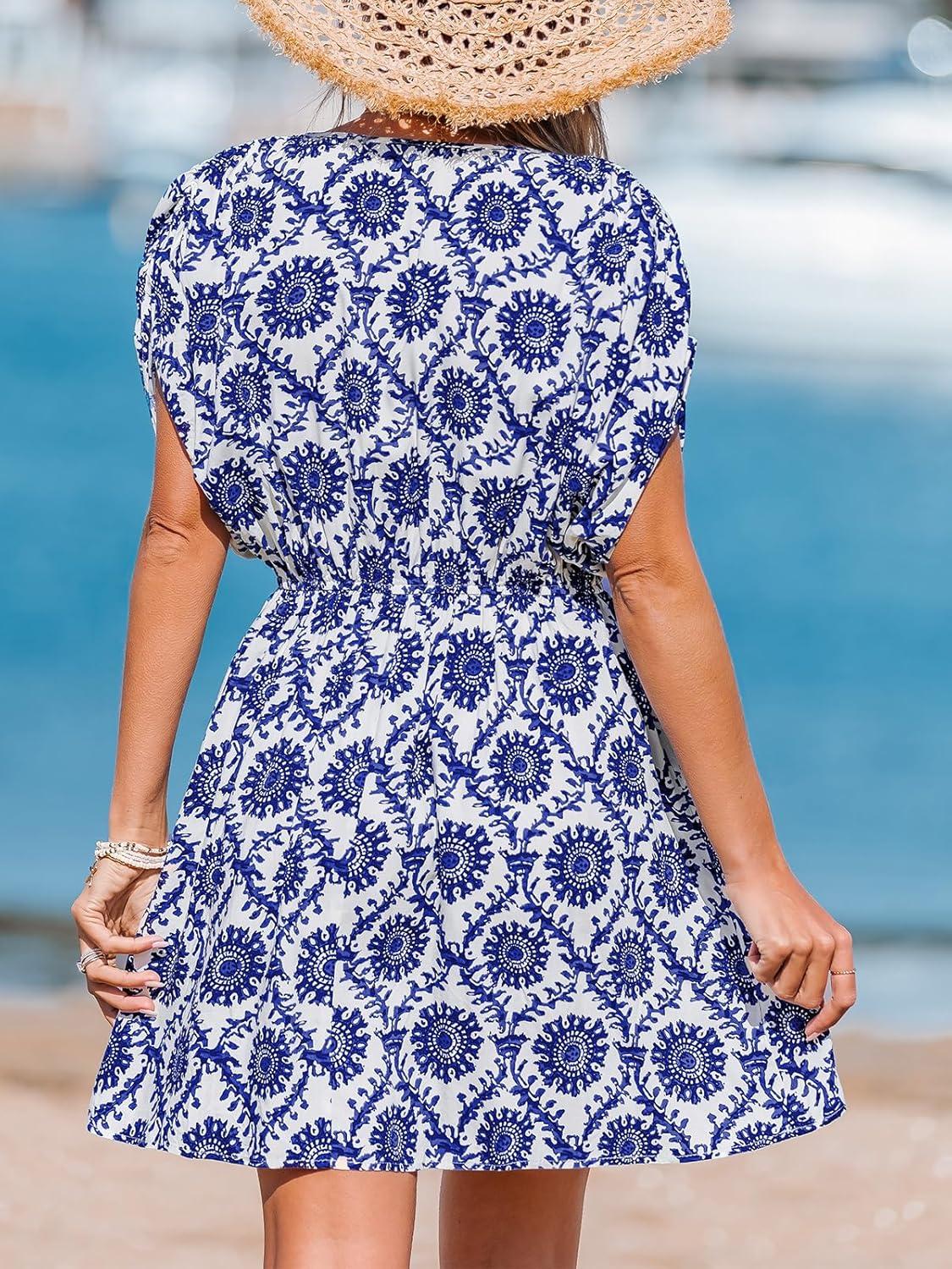 CUPSHE Women’s Swimsuit Coverup Short Sleeve Boho Swimwear Beach Cover Ups Elastic Waist Mini Dress(Blue)