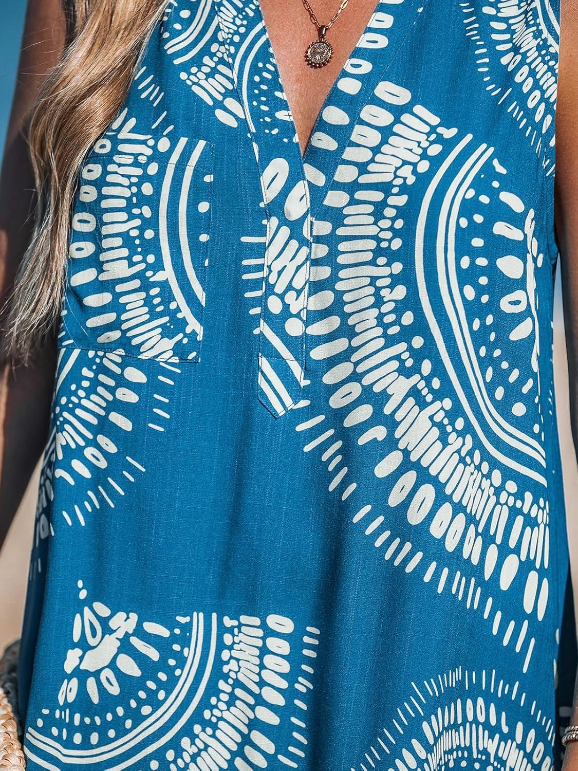 CUPSHE Swimsuit Coverup for Women V Neck Beachwear Sleeveless Beach Dress with Chest Pocket(Blue Patterned)