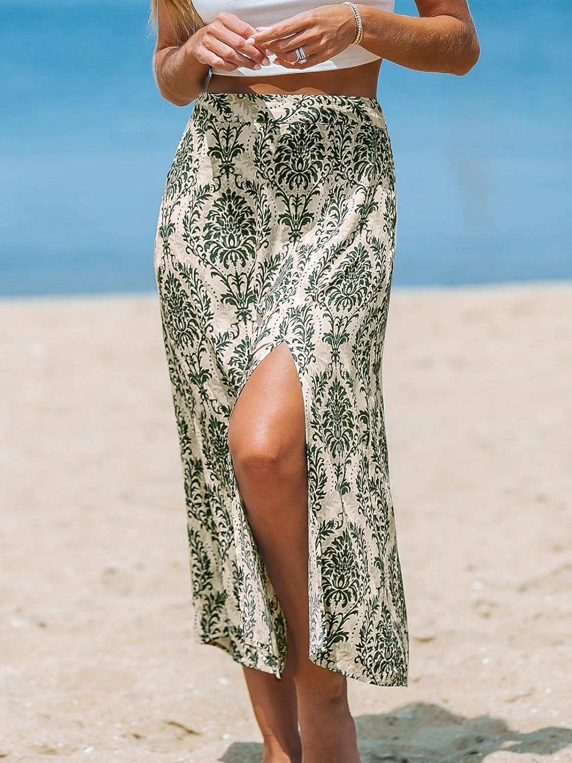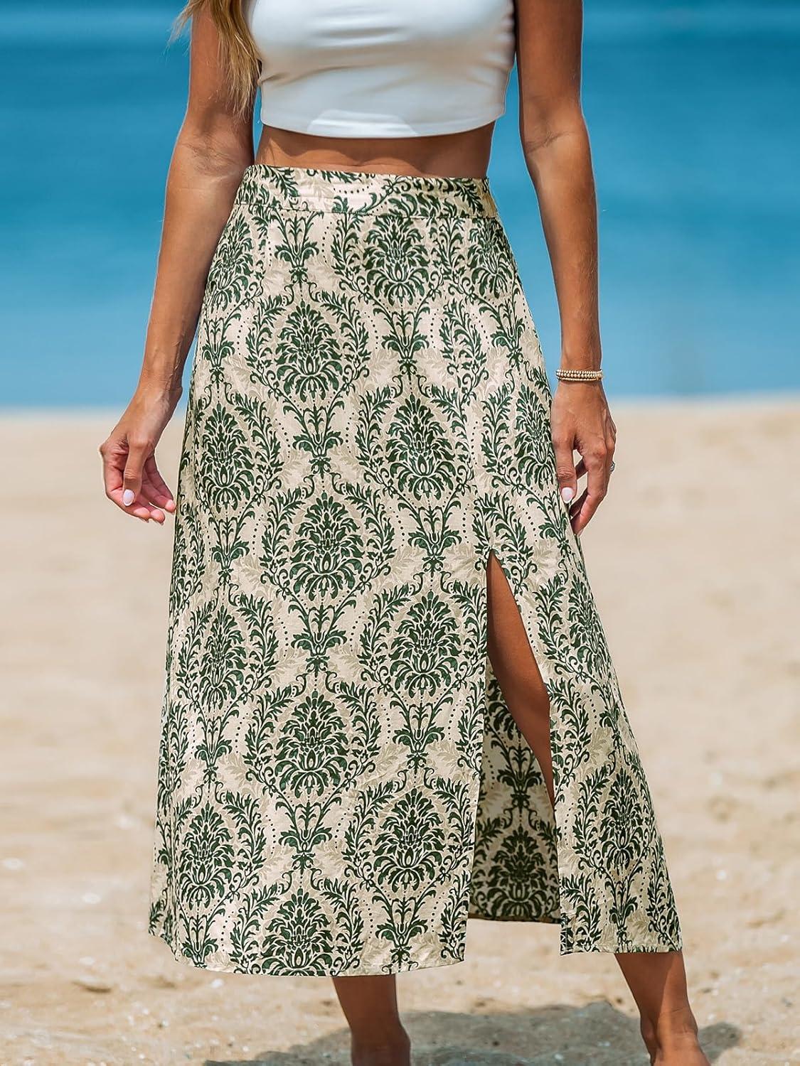 CUPSHE Skirts Woven Side Slit Midi Skirt High Waist Ornate Cover-Up Sarong Casual Vacation(Green)