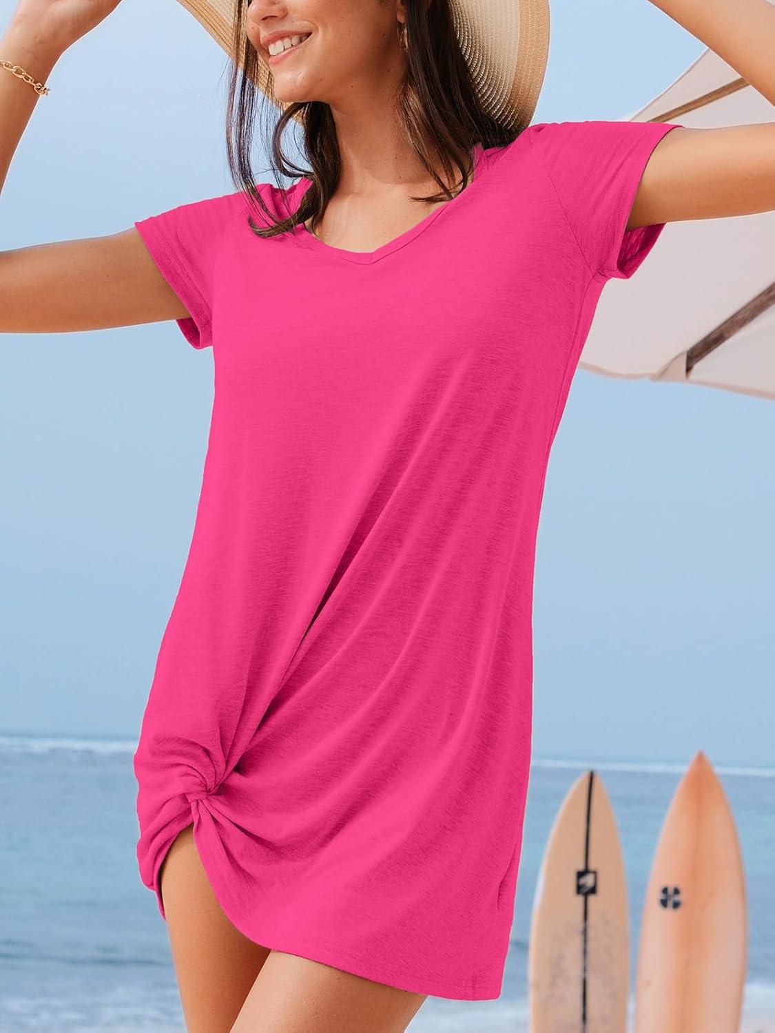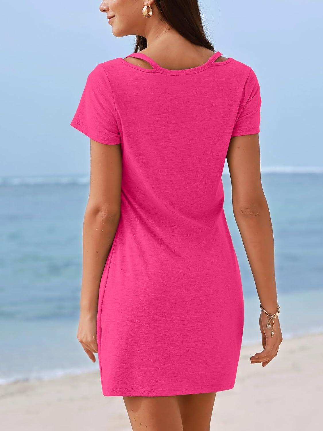 CUPSHE Summer Dresses for Women Short Sleeve Twisted Casual T Shirt Dress Beach Swimsuit Coverup(Rose Red)