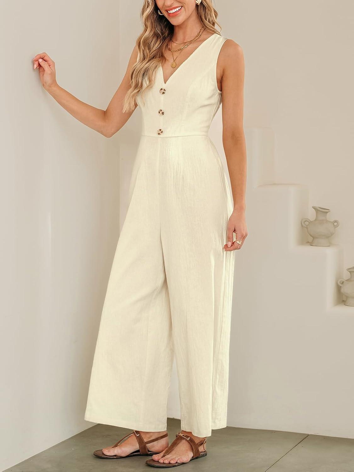 CUPSHE Women’s Summer Jumpsuit V Neck Sleeveless Button Front Wide Leg Beach Vacation Outfits(Beige)