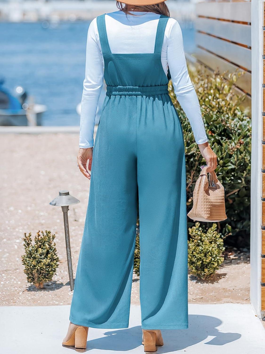 CUPSHE Women’s Summer One Piece Jumpsuits Sleeveless Button Wide Leg Overalls Loose Rompers with Pockets Vacation Outfits(Blue)