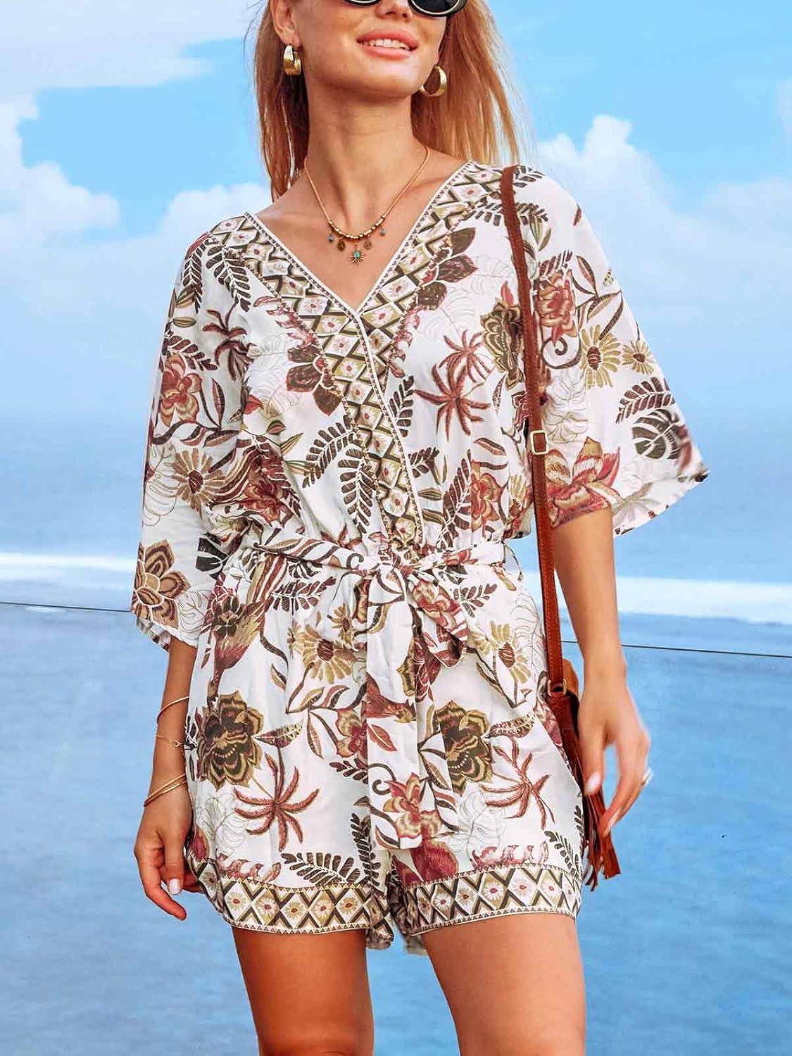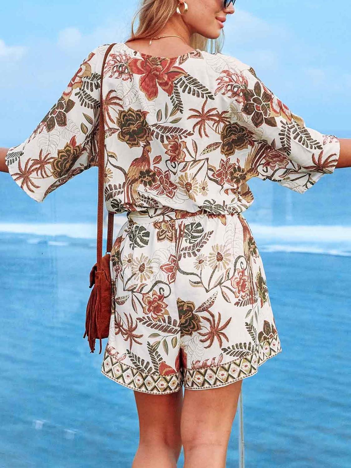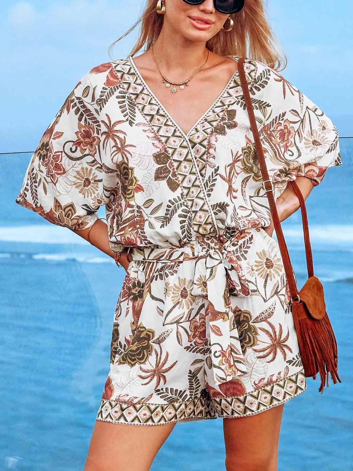 CUPSHE Women’s Summer Romper Lace Up Printed Half Sleeves Casual Wide leg Vacation Outfit Mini One Piece Jumpsuit(Coffee Printed)