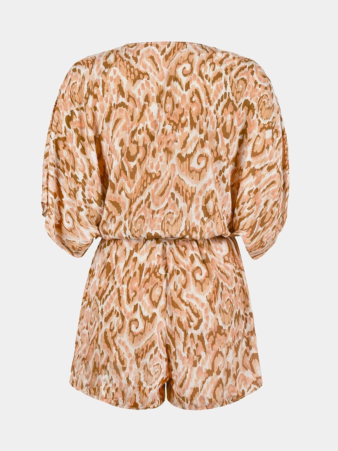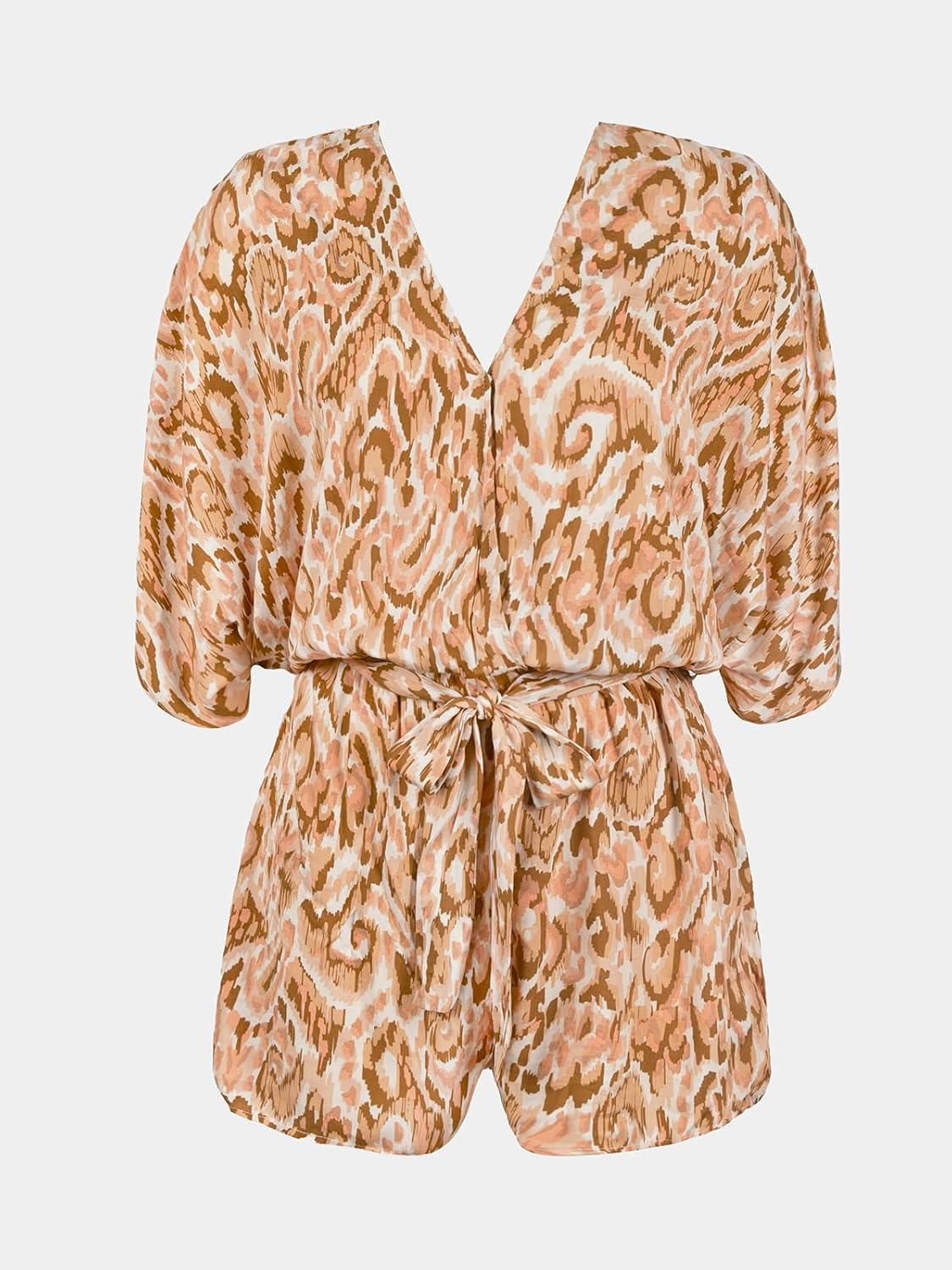 CUPSHE Women’s Summer Romper Lace Up Printed Half Sleeves Casual Wide leg Vacation Outfit Mini One Piece Jumpsuit(Brown Printed)